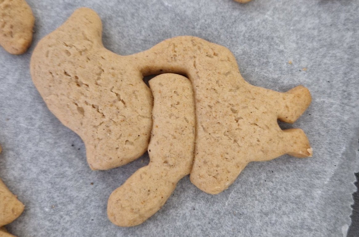 Не се ползва миксер, първо малко се разбиват яйцата с бъркалка, добавяш в тях олиото, ванилиите и други подправки, содата и брашното - първо забъркваш тестото в купа и когато стане годно за месене, го прехвърли на плота върху брашно и го омеси до гладко твърдо тесто. Остави го малко да си почине завито и разточвай. По рецептата пише да се разточва с дебелина 5 мм, но ти гледай твоите формички, може по-дебеличко. Най-добре първо направи проби с малко тесто и различна дебелина.
