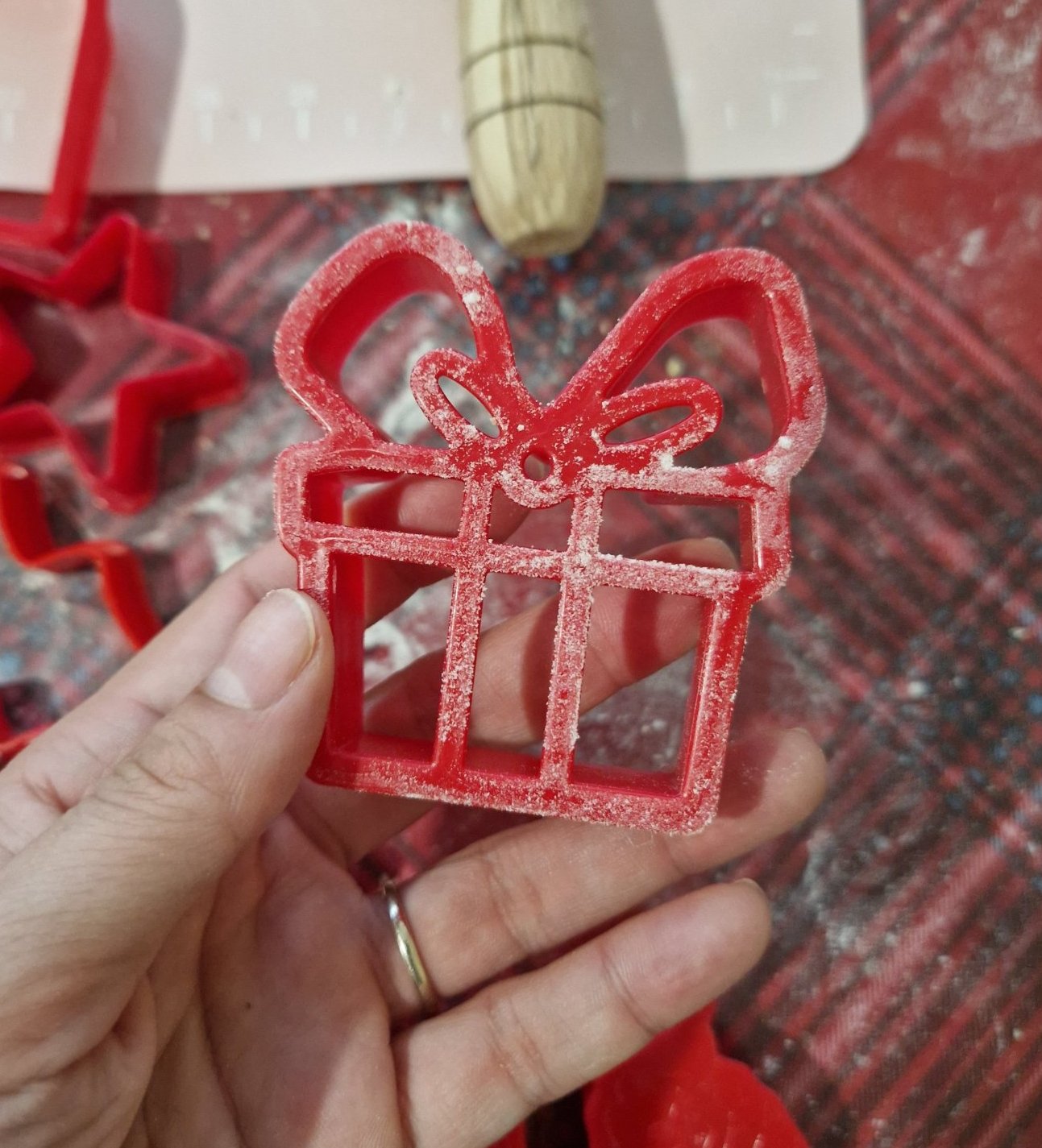 Не, разточи го да е дебело колкото е формата, примерно 1см. Потопи острата част на формата, не тази, която си показала на последната снимка в брашно и натисни докрая. Така ще се отбелжи, дано и да се отдели цялата, без да се счупи.