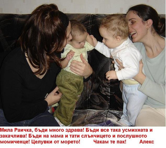 Честит първи рожден ден на Рая! Да е здрава, усмихната и да има щастливо детство, изпълнено с много игри! На мама Жени - да се наслаждава на всеки миг с Рая и нищо да не я тревожи!