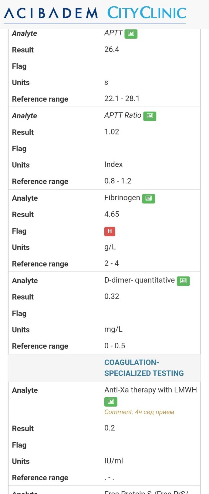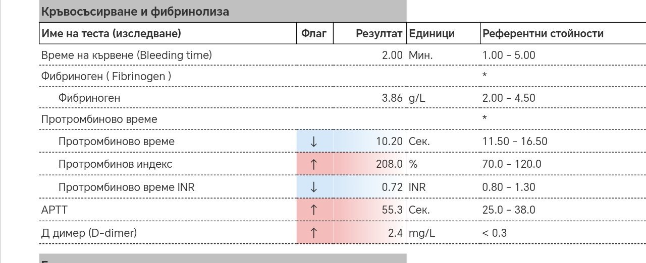 Преди седмица боледувах от грип, а това са ми резултатите от коагулацията от днес. В 34г.с. на Клекс@N 0.4. Чакам коментар от лекар, но съм озадачена как фибриногенът е в норма на фона този Д-димер. За първи път имам отклонения в АПТТ, в индекса и толкова висок Д-димер. Вчера пропуснах да си сложа инжекцията и я сложих след след като ми взеха кръв, но чак такива отклонения не съм очаквала.