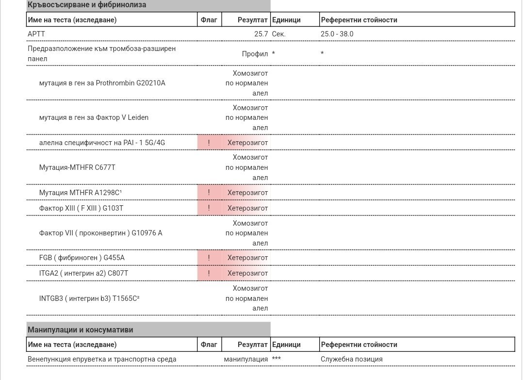 Здравейте. Изследвах за първи път тромбофилия (все още не съм бременна, имам едно дете и не съм имала никаква терапия през бременността) и резултата не ми е никак ясен. Виждам доста мутации. Моля по-запознатите ако е възможно да ми разяснят. Благодаря предварително