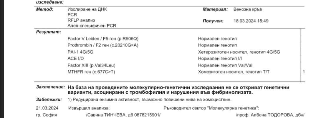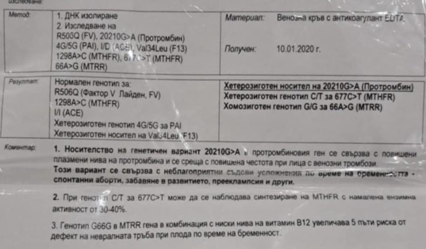 Здравейте! Пиша по повод че имам два аборта! Единия бе заради малоформация на горни крайници(при които си имах и зацапване от време на време) а вторият аборт получих кръвотечение и в последствие се установи липса на пулс. От Варна съм и посетих хематолог др.Стайкова по повод тези изследвания тя каза че нямам данни за тромбофилия но като профилактика ми назначи по време на опитите натаспин и после @sпирин протект и следене на показатели.Посетих и генетик Константинова, която според нея имам данни за тромбофилия и ми назначи терапия с аспirин + фр@ksсипарин 0.3 и проследяване на показатели. Въобще не се препокриха мненията. Единствено за фолиевата киселина че трябва да е мета форма и много се обърках при следващата бременност как да действам.Притеснява ме и факта да не би и @sпирина да  ми предизвика кървене.