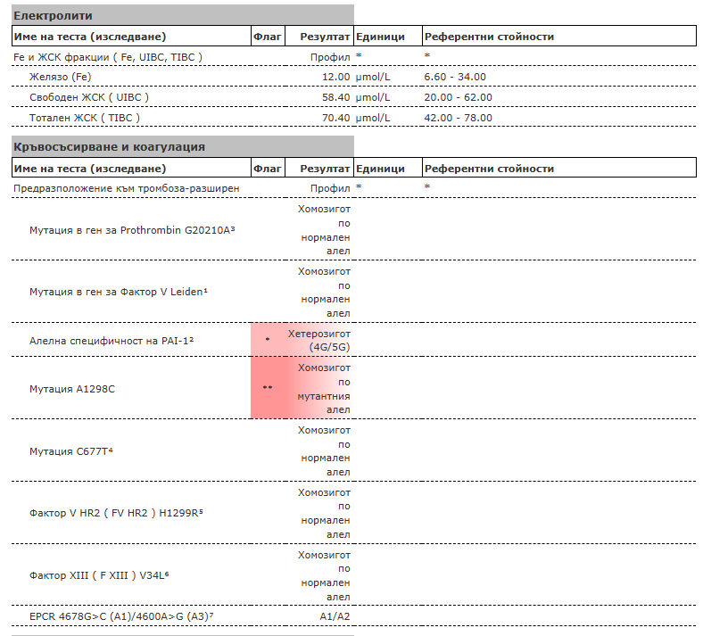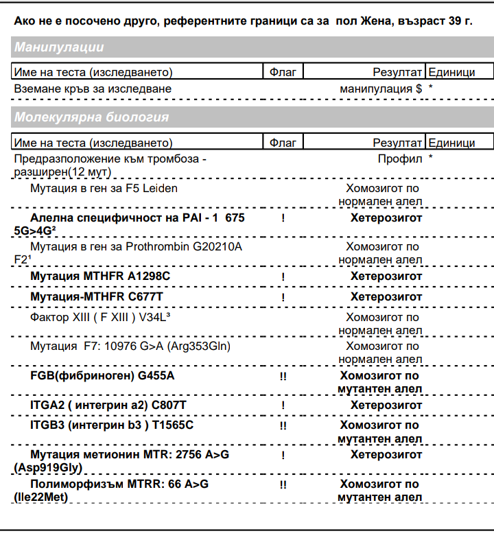 От изследванията за тромбофилия - имате няколко нискорискови мутации, свързани с неправилно функциониране на различни фактори в процеса на кръвосъсирване, както и няколко, свързани с неусвояване на важни за бременността витамини.