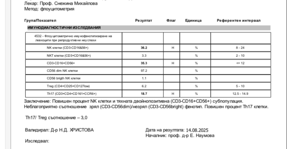 Здравейте! Излязоха моите резултати и като заключение имам повишени двойноположителни НК клетки, неблагоприятно съотношение зрял (CD3-CD56dim)/незрял (CD3-CD56bright) фенотип, повишен процент Th17 клетки.