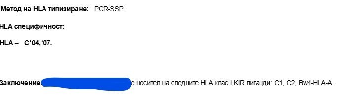 Момичета, резултатът на партньора ми излезе, качвам го по-долу. Напомням, че аз съм с КИР с хаплотип АА с генотип ID1. АНА профила ми излезе вчера - отрицателен е. Имам час за консултация с Михайлова на 19ти, но до тогава ако някой разбира какво означава нашата комбинация, ще съм благодарна.