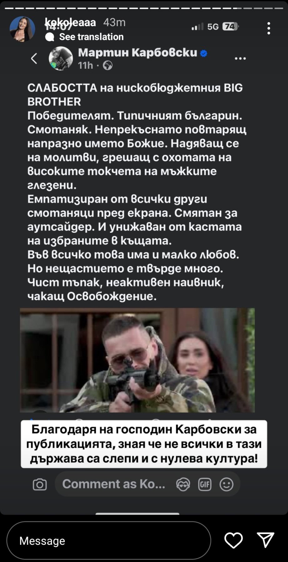 Радвам се, че спечели Марио. Има си като всеки и лоши, и добри черти, смешно е някой да очаква от ББ пример за подражание. Не гласувах за него от съжаление, а от възхищение как съумя да си изиграе играта. Ако е успял и ББ да вземе на своя страна, за да не показва изцепките му - още повече.