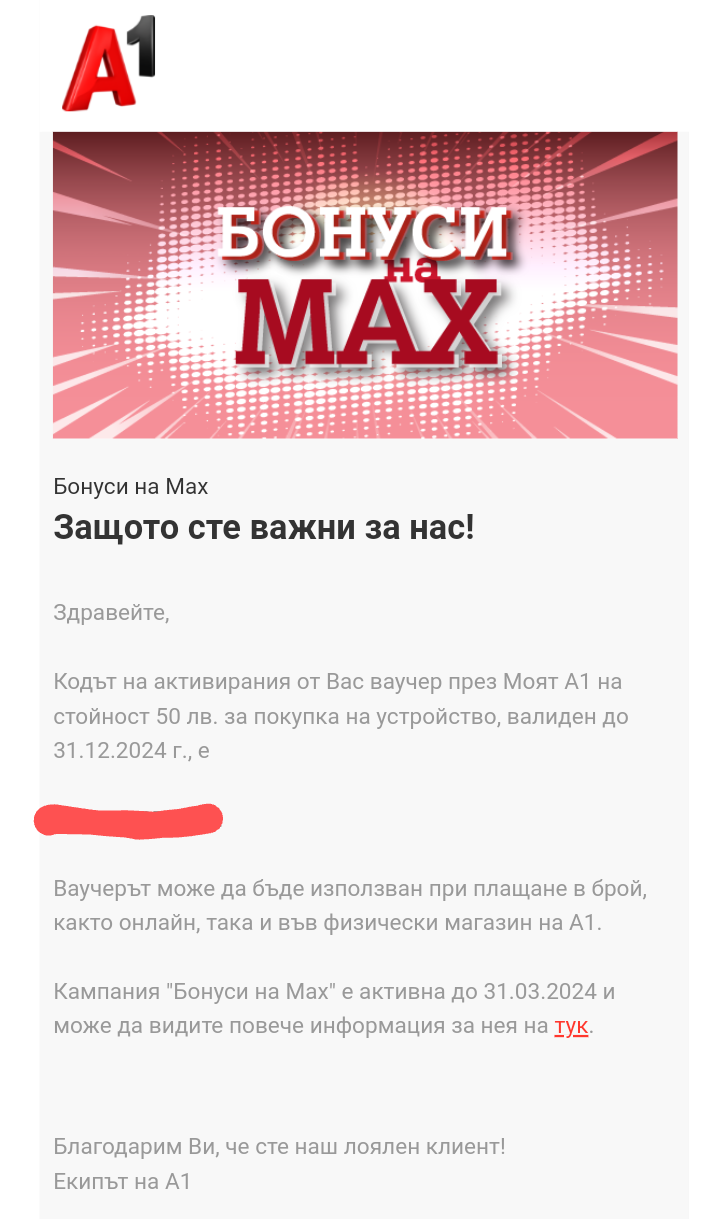Здравейте, имам ваучер за покупка от А1, съвсем забравих за него, защото не ми се е налагало да купувам нищо. Ако ще послужи на някой, да пише на лични Simple Smile