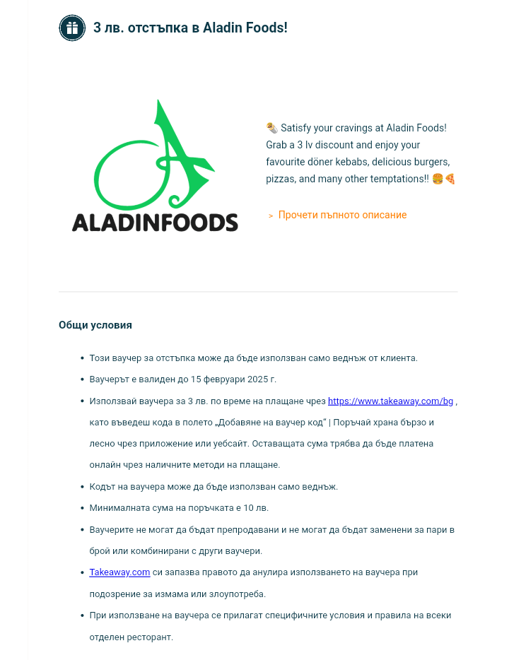 Подарявам код за 3лв Aladin Foods в Takeaway, който го иска, да пише на лични Simple Smile