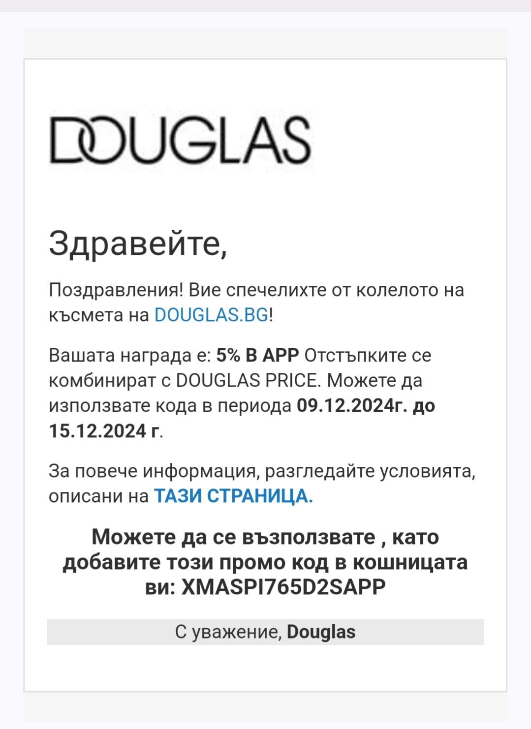 Имам код, спечелен от колелото на Дъглас за 5 лева. Важи за покупки над 100 лв., включително и намалени.