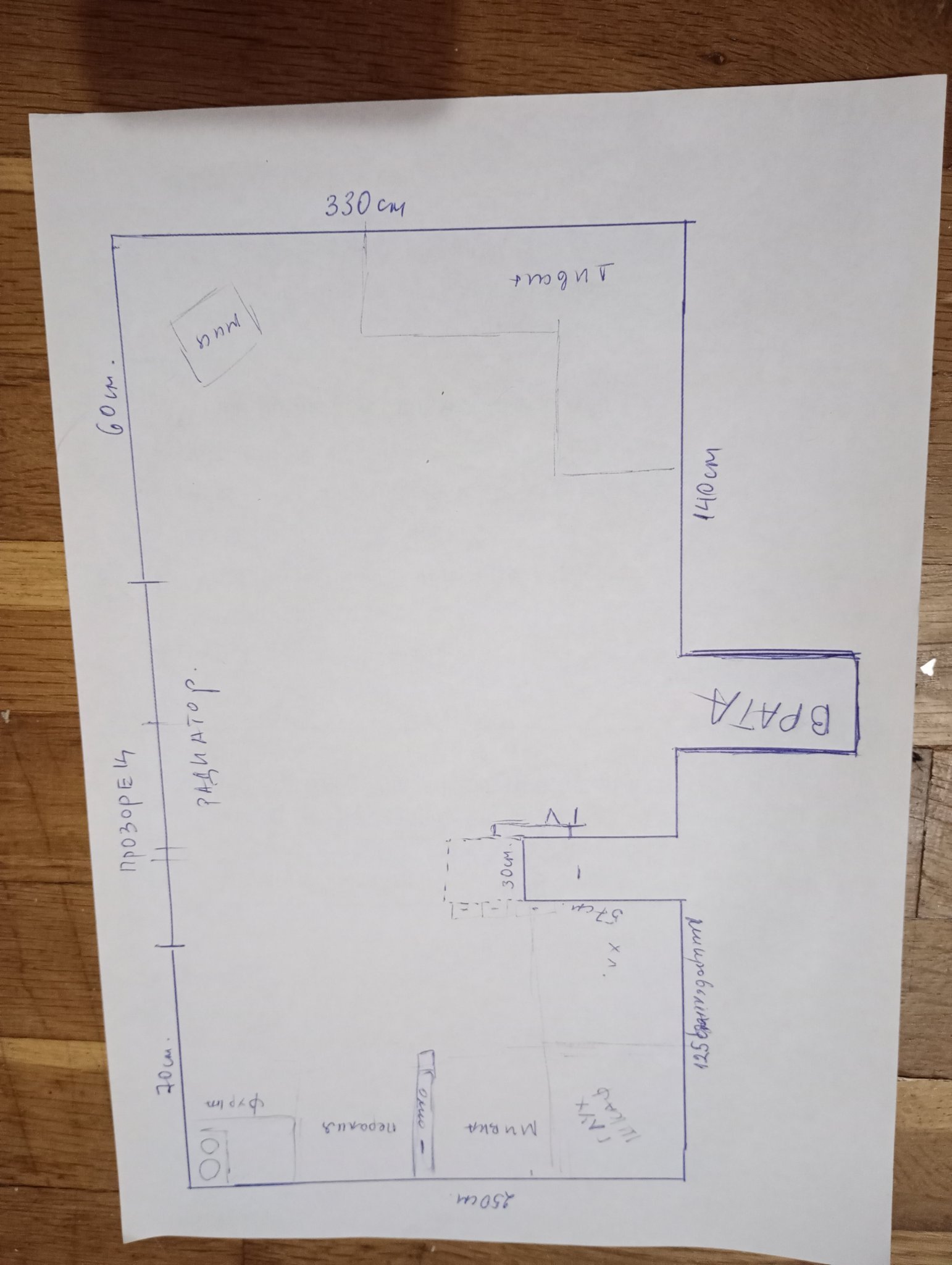 Имам нужда от идеи за това помещение ще бъде малка кухня и хол .Проблем е липсата на място за солни шкафове ,затова има идея за вградени в колоната която ще се доизгради и ще отделя кухня от хол .От другата страна на колоната ще има телевизор .