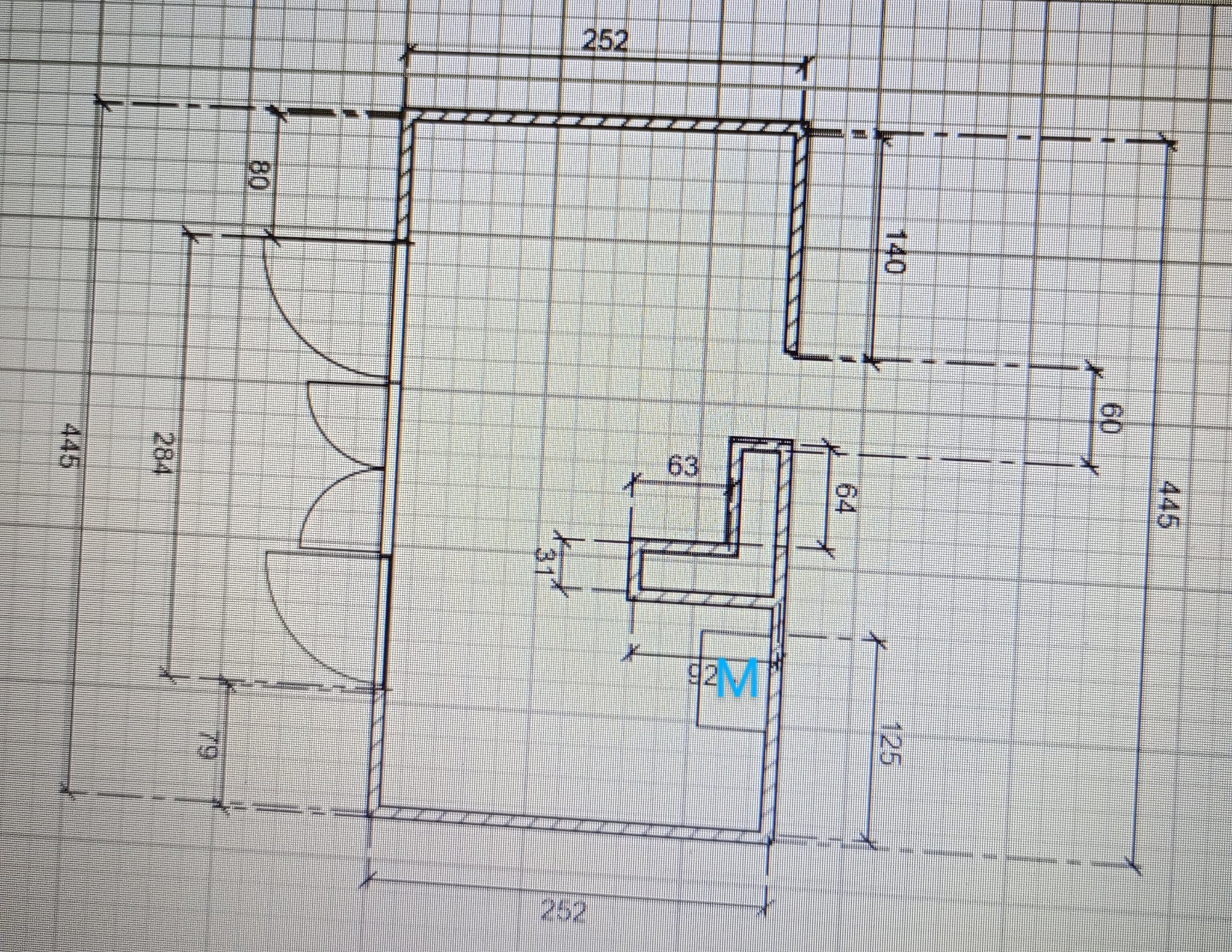 Стената дето пише 125, би трябвало да е повече. Размерът на чертежа не е за цялата стеничка, а и като се сумират другите размери, остават 150 до 445.