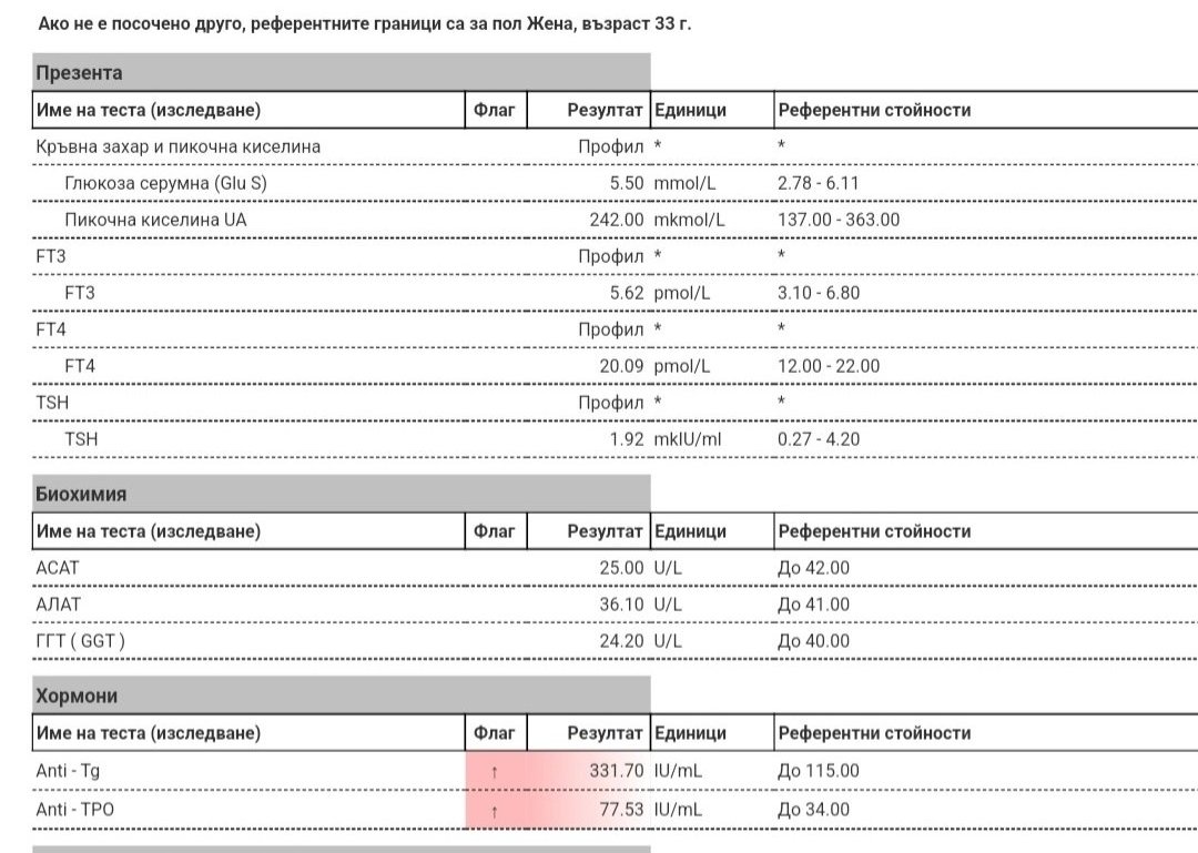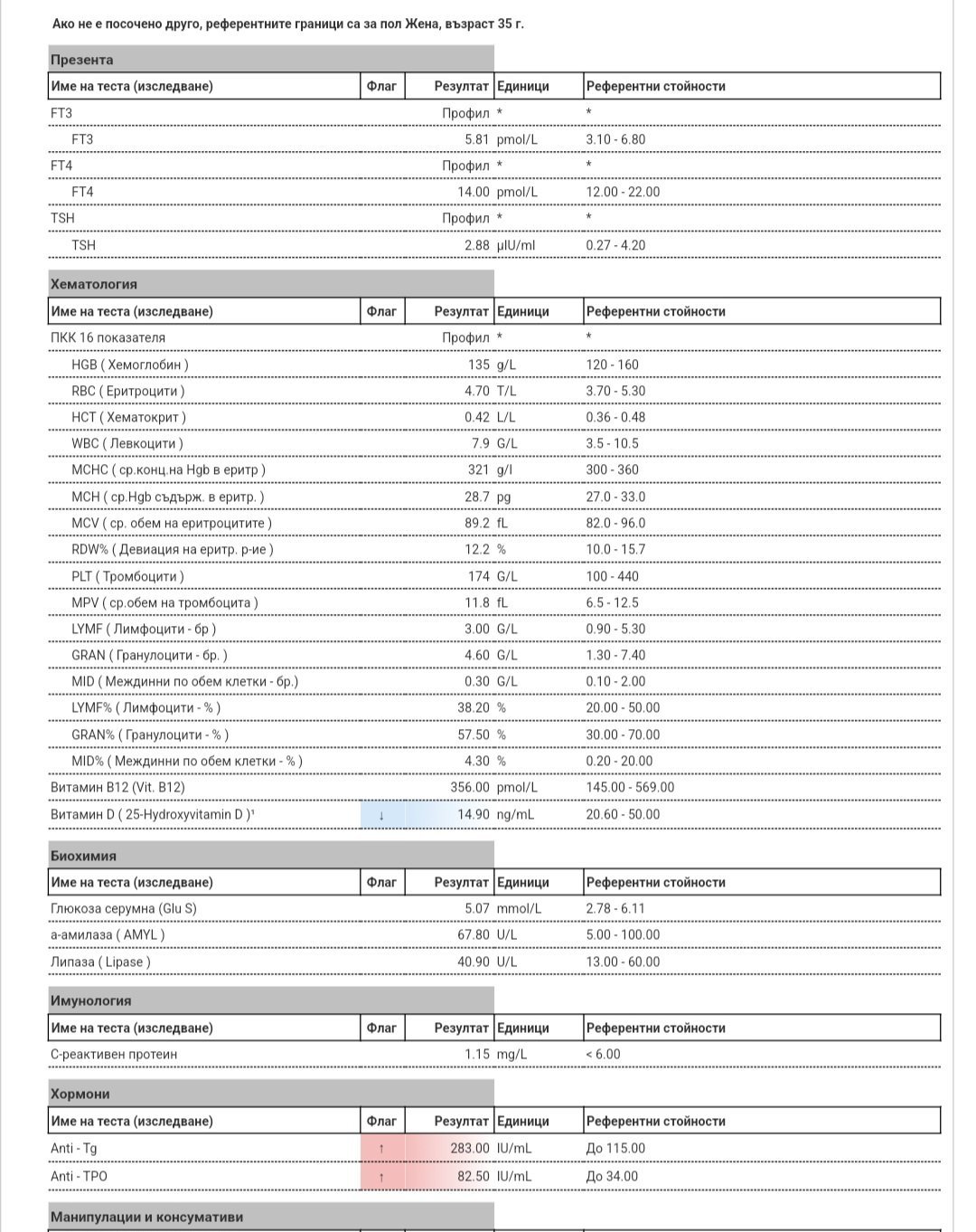 И да не е въпроса ми само за витамините, ще си покажа и последните изследвания. За първи път имам TSH над 2. Никога не съм пила хормон, защото до сега ми бяха добре хормоните... Но тръгвам към хипофункция май вече... От 10г знам че съм с Хашимото иначе. Започнах да запълвам дефицида на вит. Д някак се надявам, че ако ги вдигна може да ми се оправят хормоните малко... Другия месец мисля да отида на ендокринолог да видим какво ще каже, като преди това мисля пак да пусна хормони да видя дали ще има промяна от сегашните и след прием на вит.Д, въпреки че не се надявам много, но.. Надеждата умирала последна 😀 Според вас в момента за хормон ли съм... Или да не бързам още?