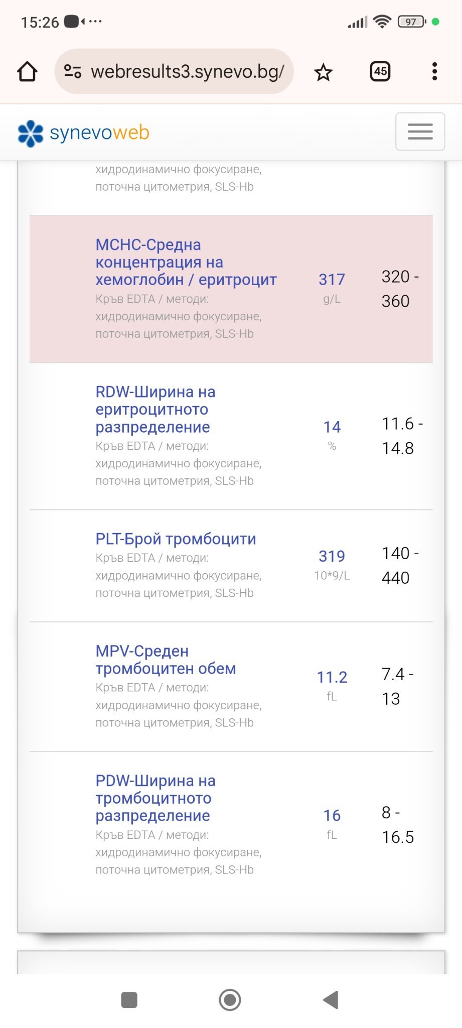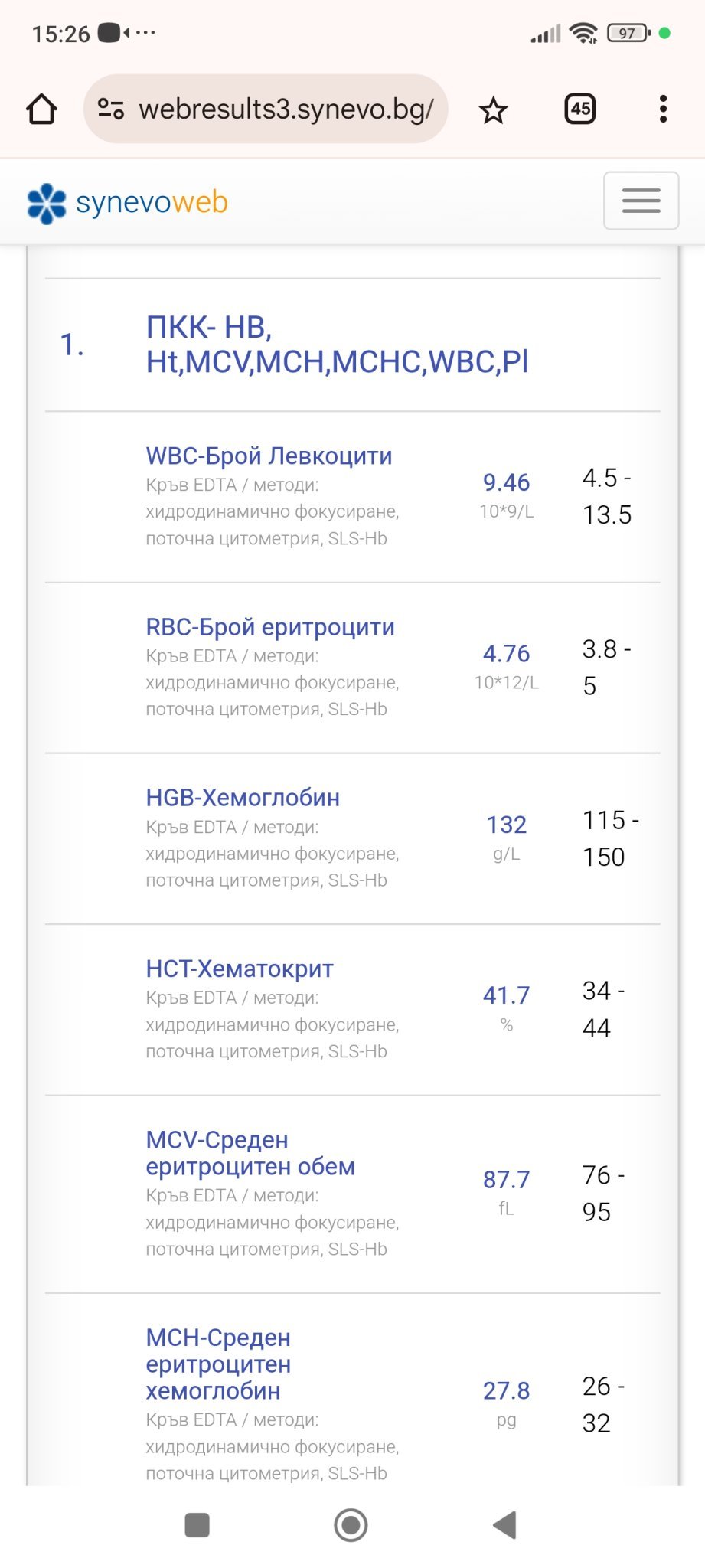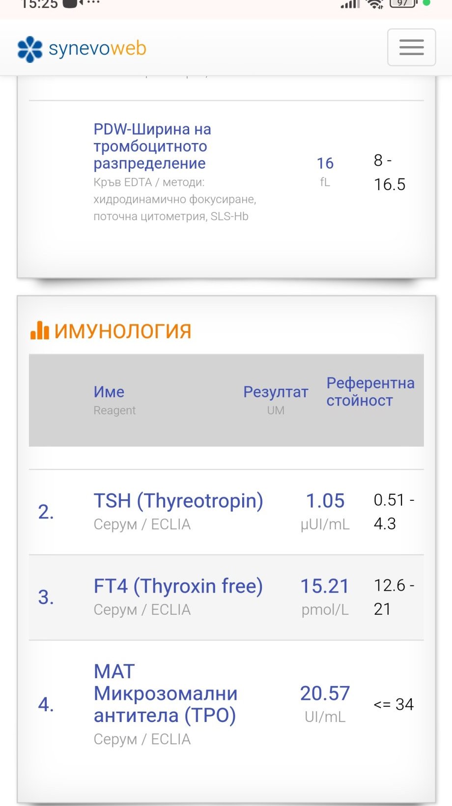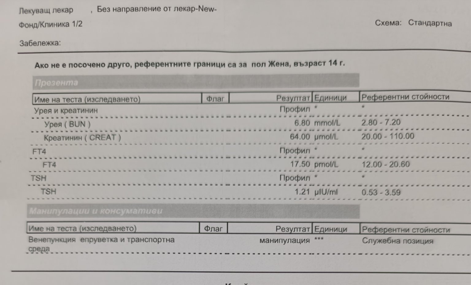 Здравейте. Може ли разчитане на резултатите на дъщеря ми. Детски ендокринолог каза,ако са в норма да не ходим на вторичен преглед, нямало смисъл. Каза да гледам референтните стойности. Тийнейджърка на 14 ,след 5 месеца става на 15 . Според мен са в норма,но.... Ходихме при Ендо във връзка с потни и студени крайници, прилошаване от време на време, много силен косопад по едно време , койот овладяхме с шампоан против косопад. И накрая 2 обърнати от дъно нокътя , вследствие на удар. Първо единия, след 3 дена другия, беше с гел лак,възможно е и това да е причината, но според маникюристката не е нормално. Пуснах изследвания в 2 лаборатории