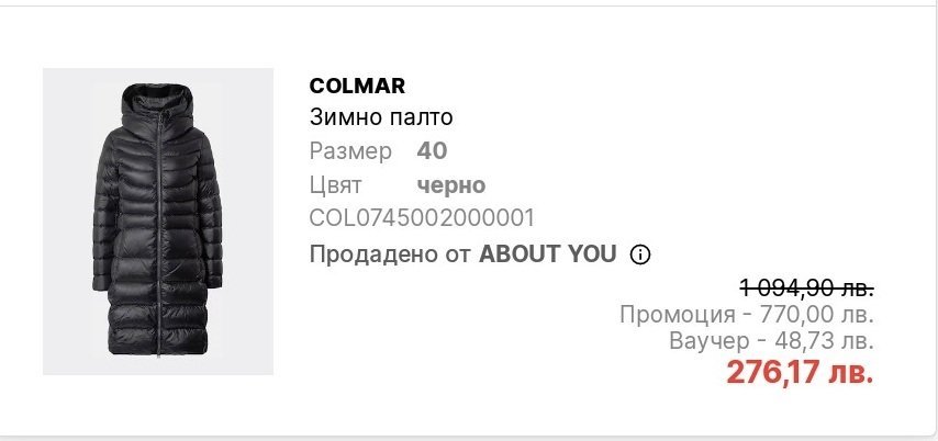 Много си е хубаво даже! Като добавим и това, че  е със супер качество, пух, дълго, леко, водоустойчиво и с качулка/или висока яка не мога да разгърна през мобилния/, става перфектно! Ако беше моя номер и нямах амнайсе якета бих го отнесла на момента.
