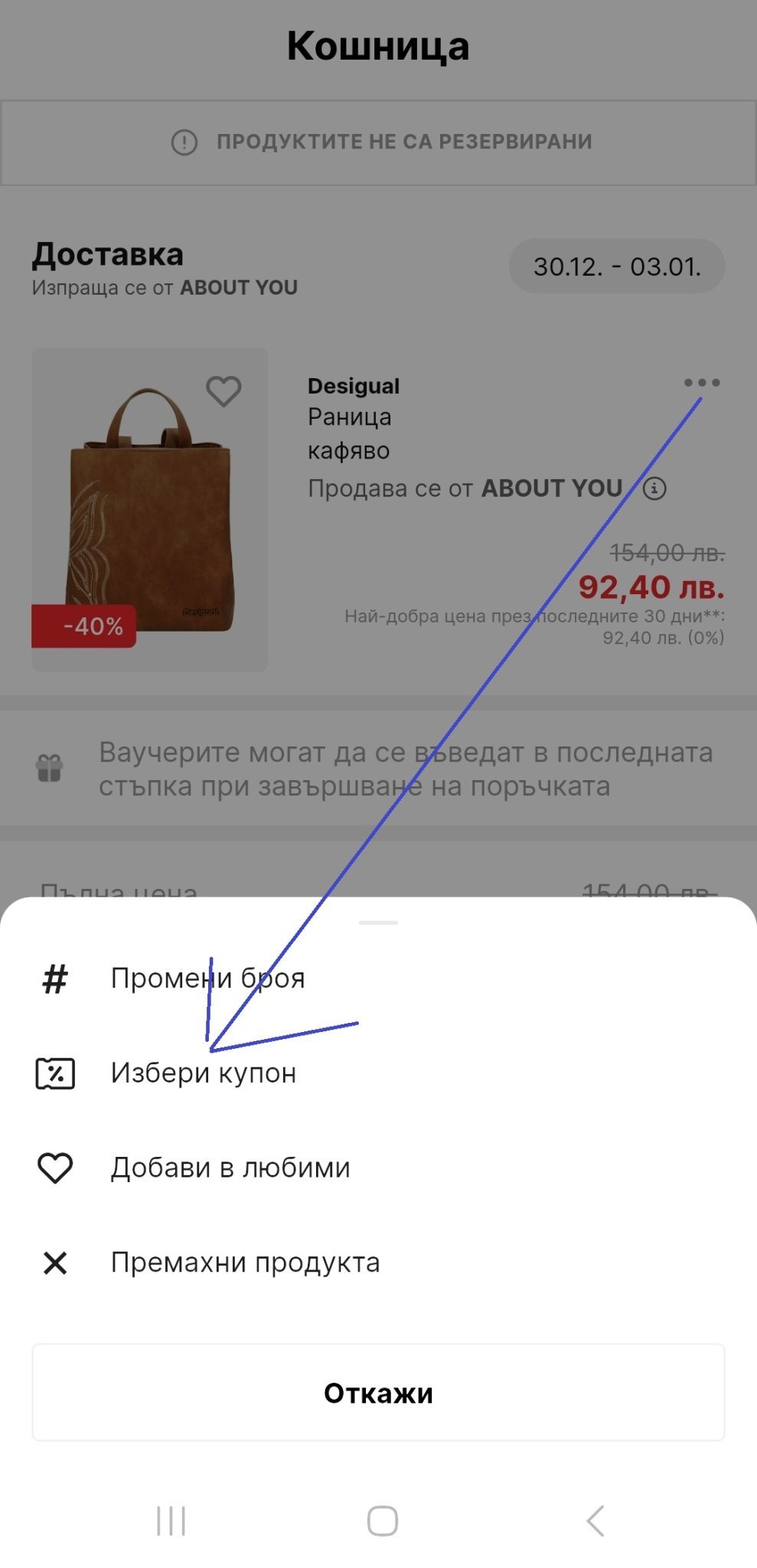 Добре тогава друго. Като го сложиш в кошницата и като натиснеш на трите точки не ти ли излиза "Избери купон'?