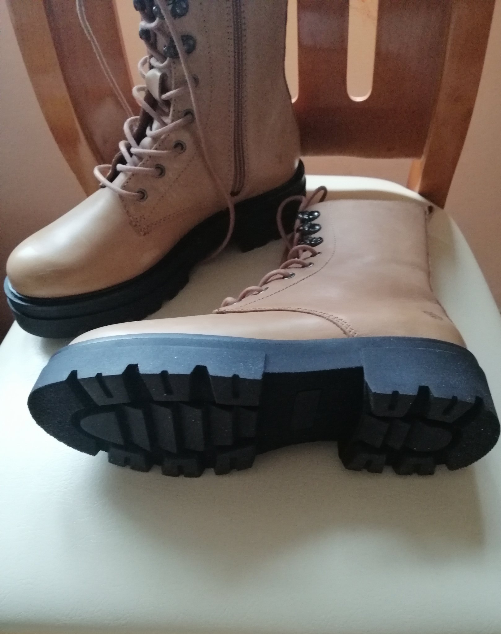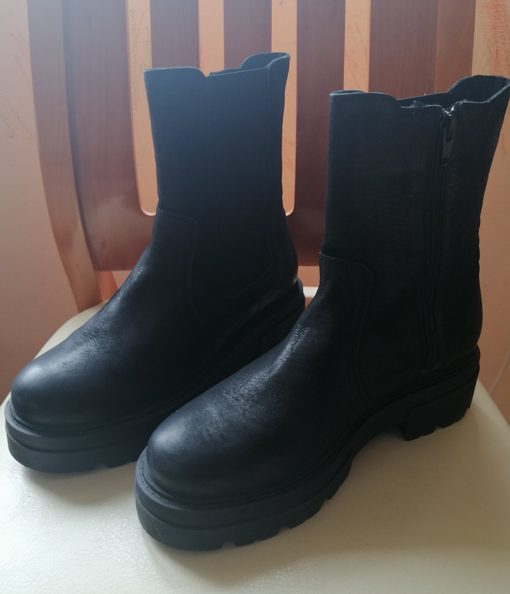 Удобен цип -  нахлузване не обичам, по крака прибрани, мека, хубава кожа - лицева с онова модното помазване все едно с четка - на снимката не излиза добре, на живо си е ефект, противохлъзгаща подметка