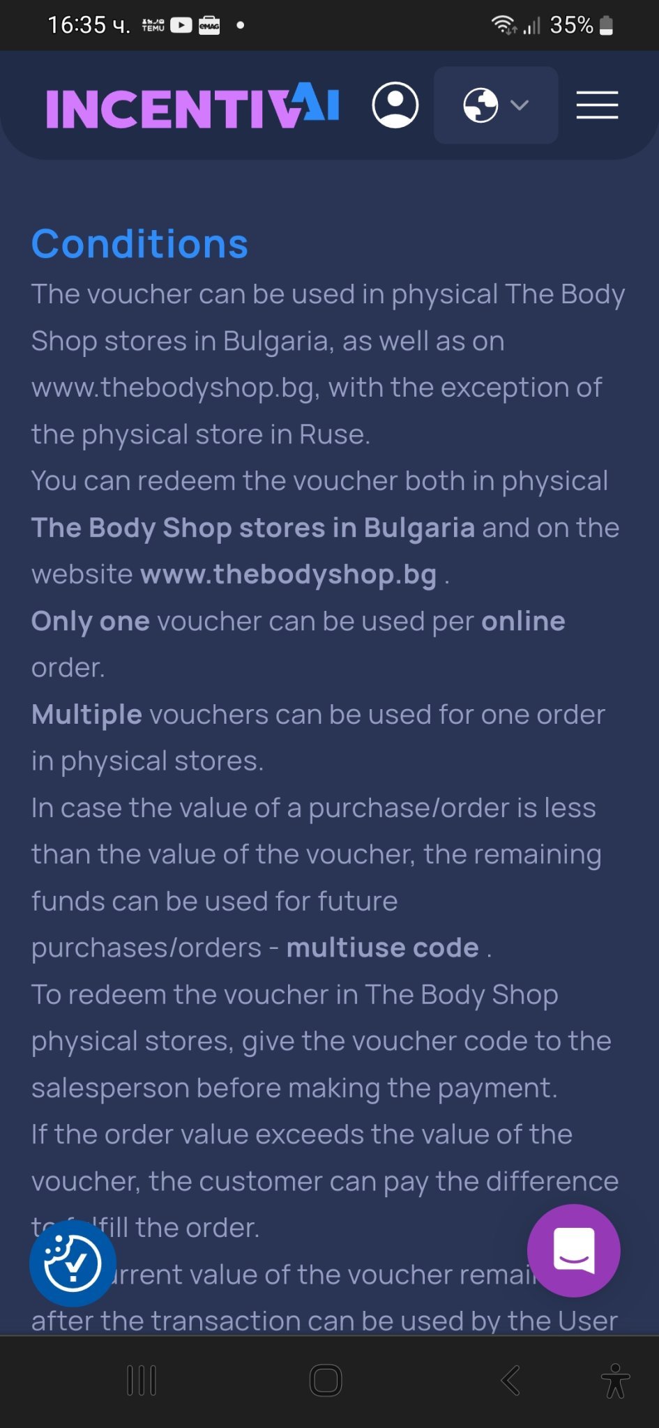 Като се цъкне върху ваучера, излизат условията. Трябва да се скролне надолу.