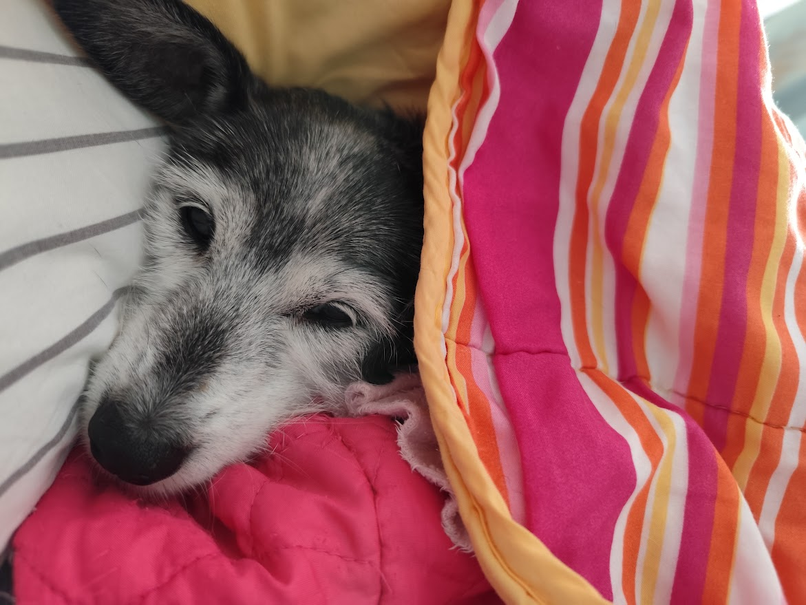 Поздрави от една рожденичка днес. Снощи се скри под юргана, уплашена от гърмежите, въпреки че в нашия квартал не беше кой знае какво. Тя и от гръмотевици така се крие.