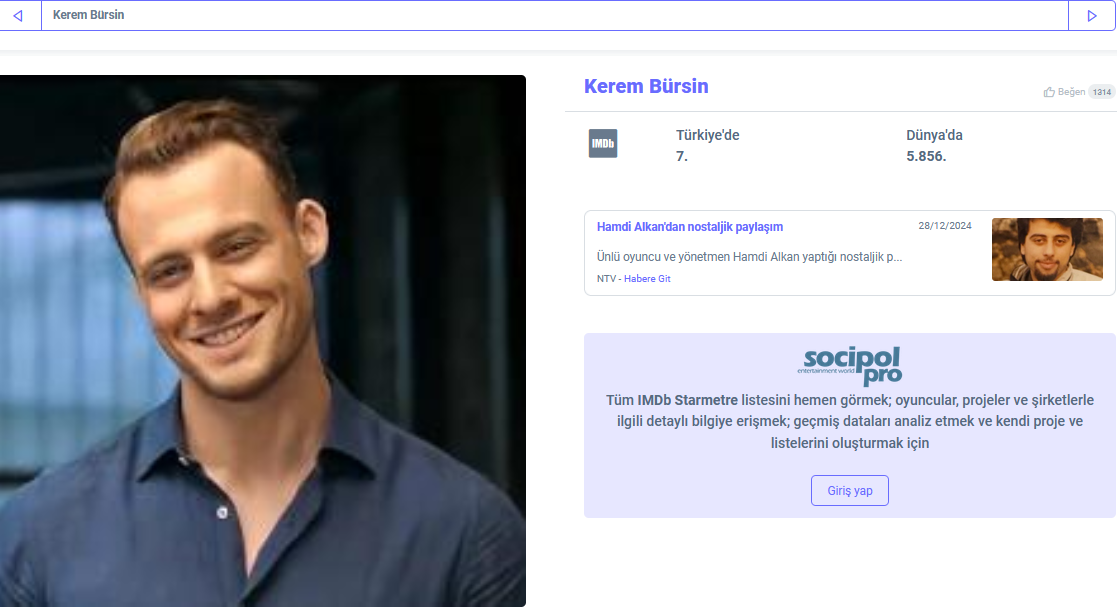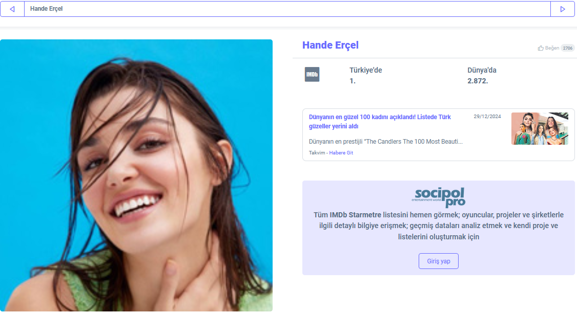 През тази седмица в IMDb STARmeter Ханде е на Първо място в Турция Trophy