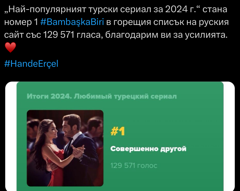 „Най-популярният турски сериал за 2024 г.“ стана Bambaşka Biri в горещия списък на руския сайт със 129 571 гласа.