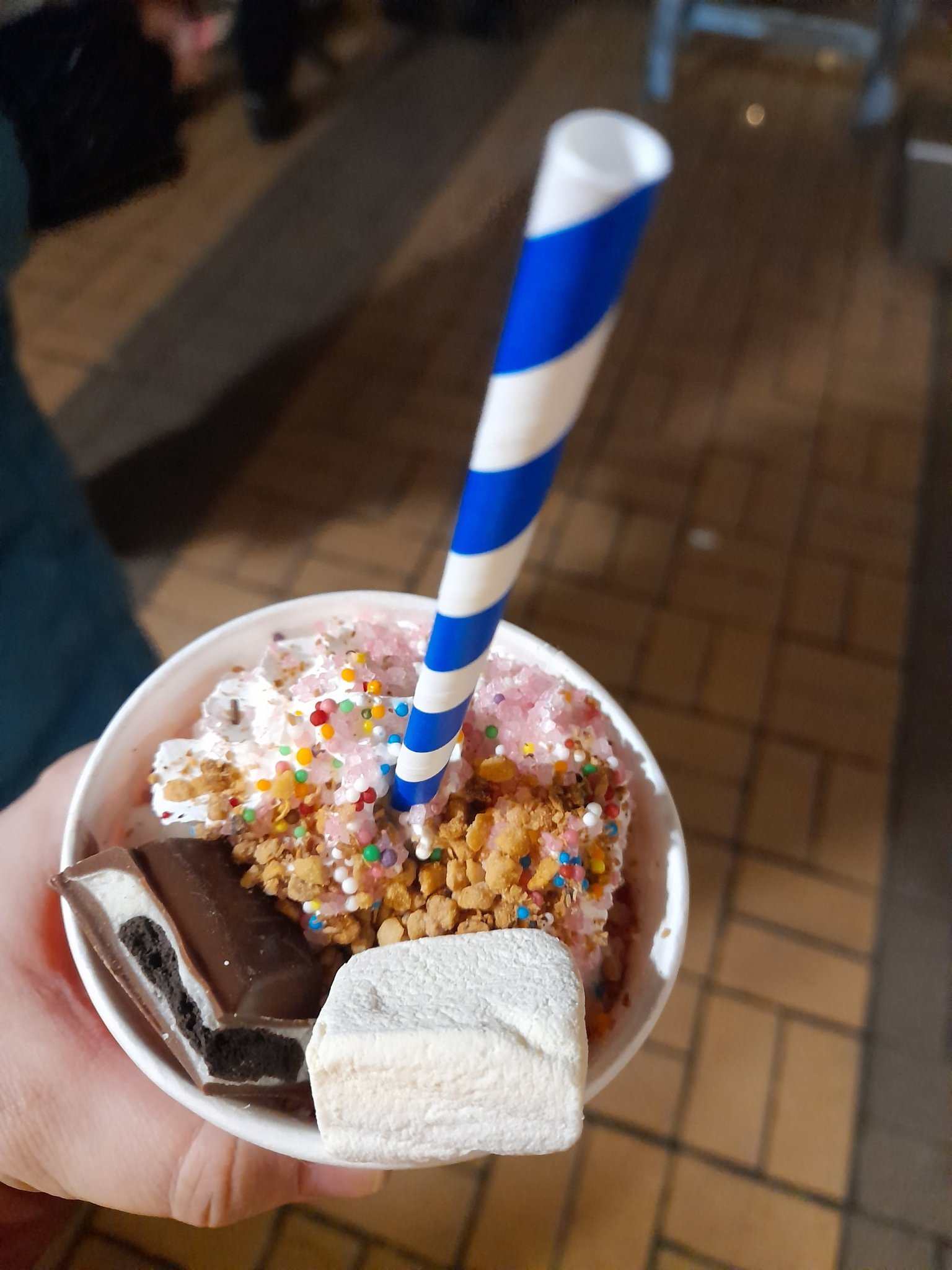 Ходихме до коледния базар в селото. Всеки ден има програма. Доста народ имаше. И се почерпих с тази калорийна бомба.