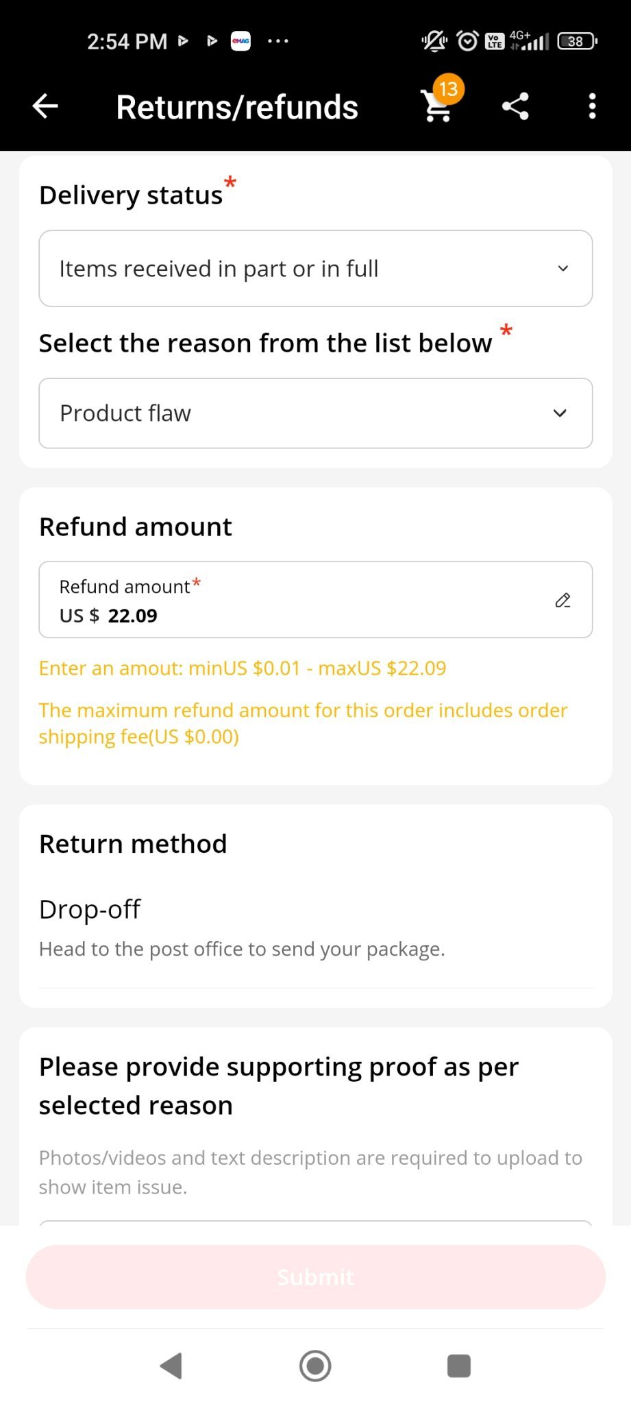 Получих дефектен продукт, писах на продавача и той отговори да искам refund. Реших да пусна диспют, но не намерих бутона за него. Избрах опцията returns/refunds, където след като избрах, че продуктът е дефектен, ми излиза поле с метод на връщане - да отида до пощата, за да върна стоката. Няма друга опция. Преди помня, че имаше възможност за връщане на парите без да се връща продуктът. Това някакви нови правила ли са, вече задължително ли е връщането? Също се чудя returns/refunds ли е правилният начин за отваряне на диспют или има и друг начин?