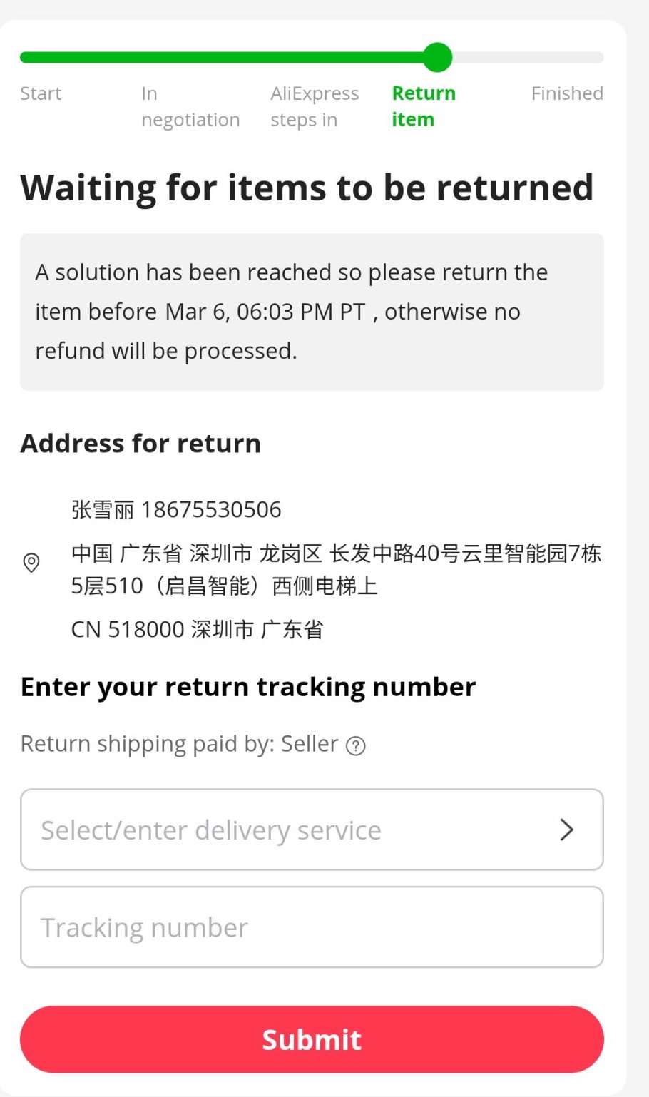 - Provide tracking number and details to confirm the return. Once the item is delivered, inform seller to proceed refund. If the seller violates, reach AliExpress with the return delivery receipt. AliExpress will issue coupon to cover it.
