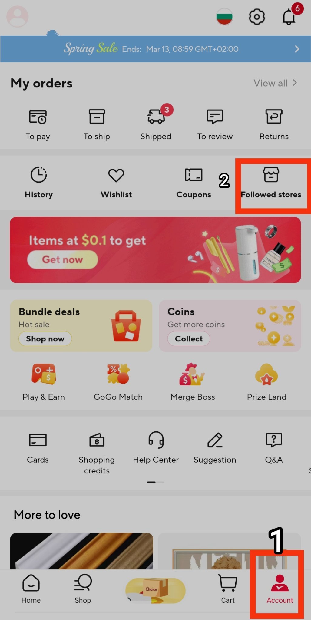 Darvo22 Списъкът с последвани магазини се достига като се отвори приложението отиваш на Account> Followed Stores