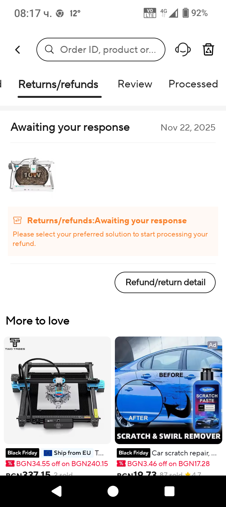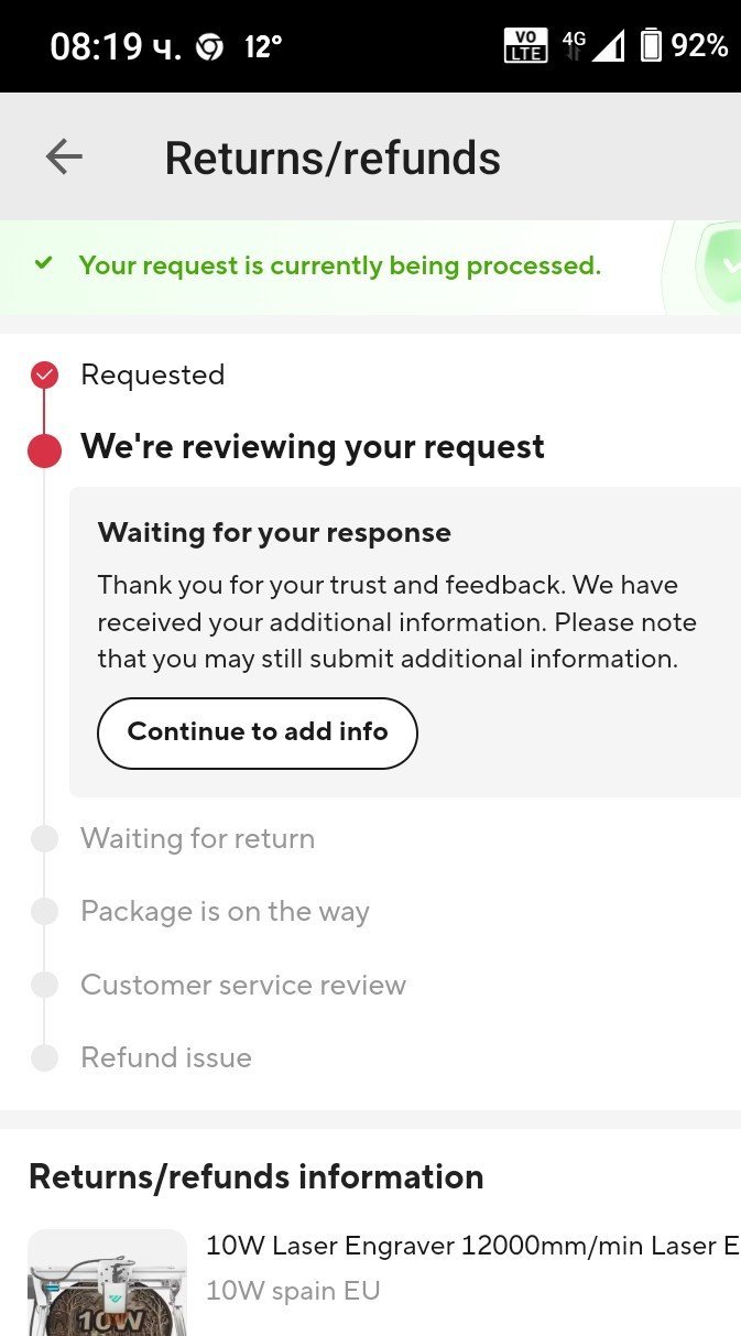 Здравейте, поръчах лазер 10w, дойде 3w. Писах на продавача ( отговаря бот) и богът задейства returns/refund. Сега стои статус, че очакват да избера опция, но освен да кача още снимки, друго нямам като бутон. Искам възстановяване, а не връщане. Какво искат от мен? Моля за помощ...