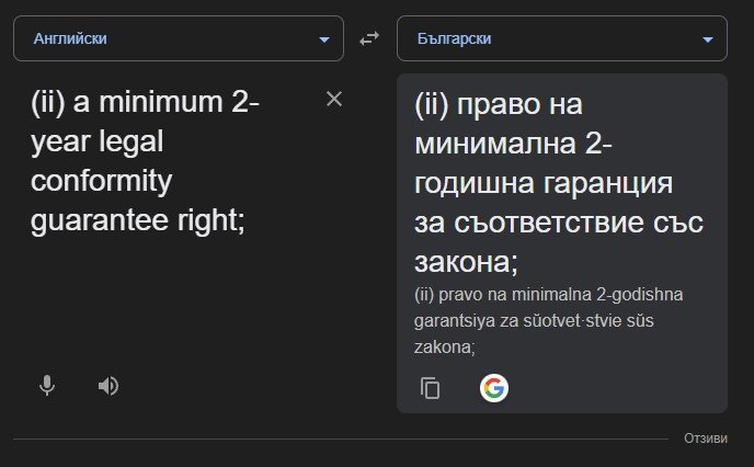 Вашите основни законови права на ЕС / ЕИП / Великобритания включват, наред с други, (i) права за изтегляне в рамките на 14 дни; (ii) минимално 2-годишно право на гаранция за правно съответствие; и (iii) правото да прекрати договора, ако продавачът не успее да достави стоките в рамките на допълнителния период от време, подходящ за обстоятелствата след първоначалния срок за доставка. Повече информация за законните права за потребителите в ЕС може да бъде намеренав Задължителни права за потребителите на ЕС,