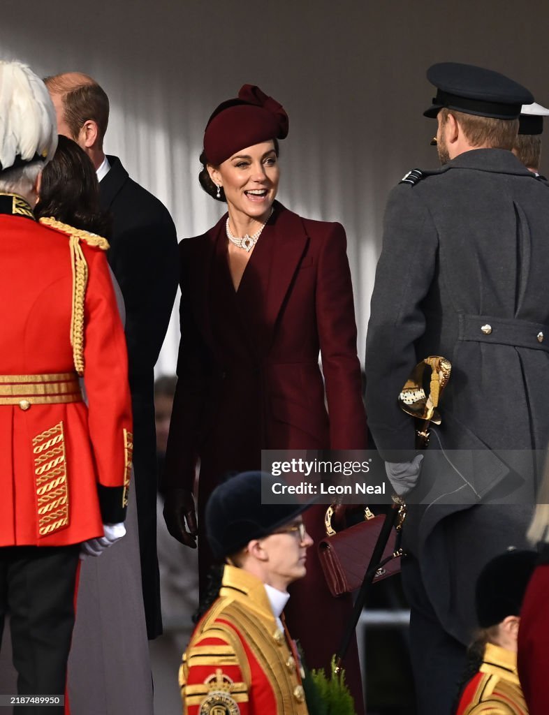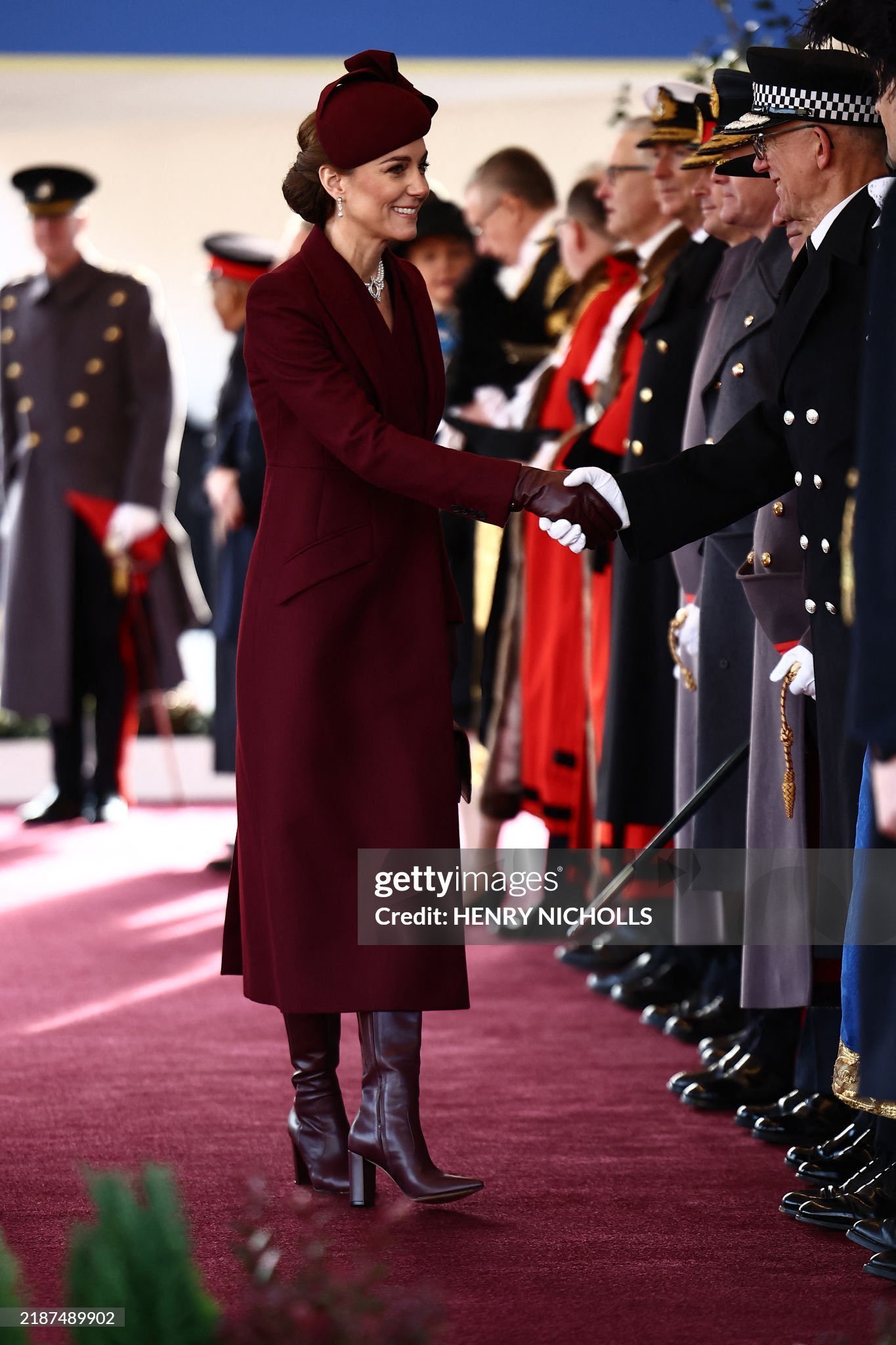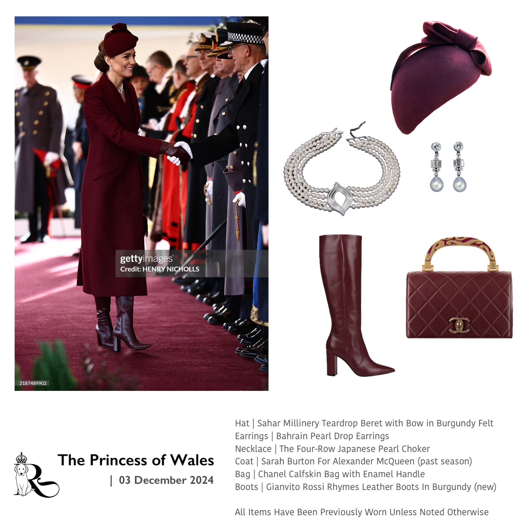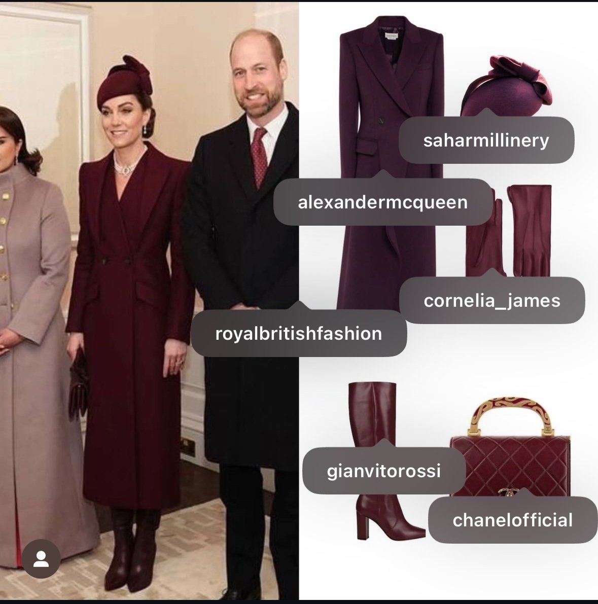 Принцесата носи бордо палто от Sarah Burton за Alexander McQueen и шапка от Sahar Millinery.
