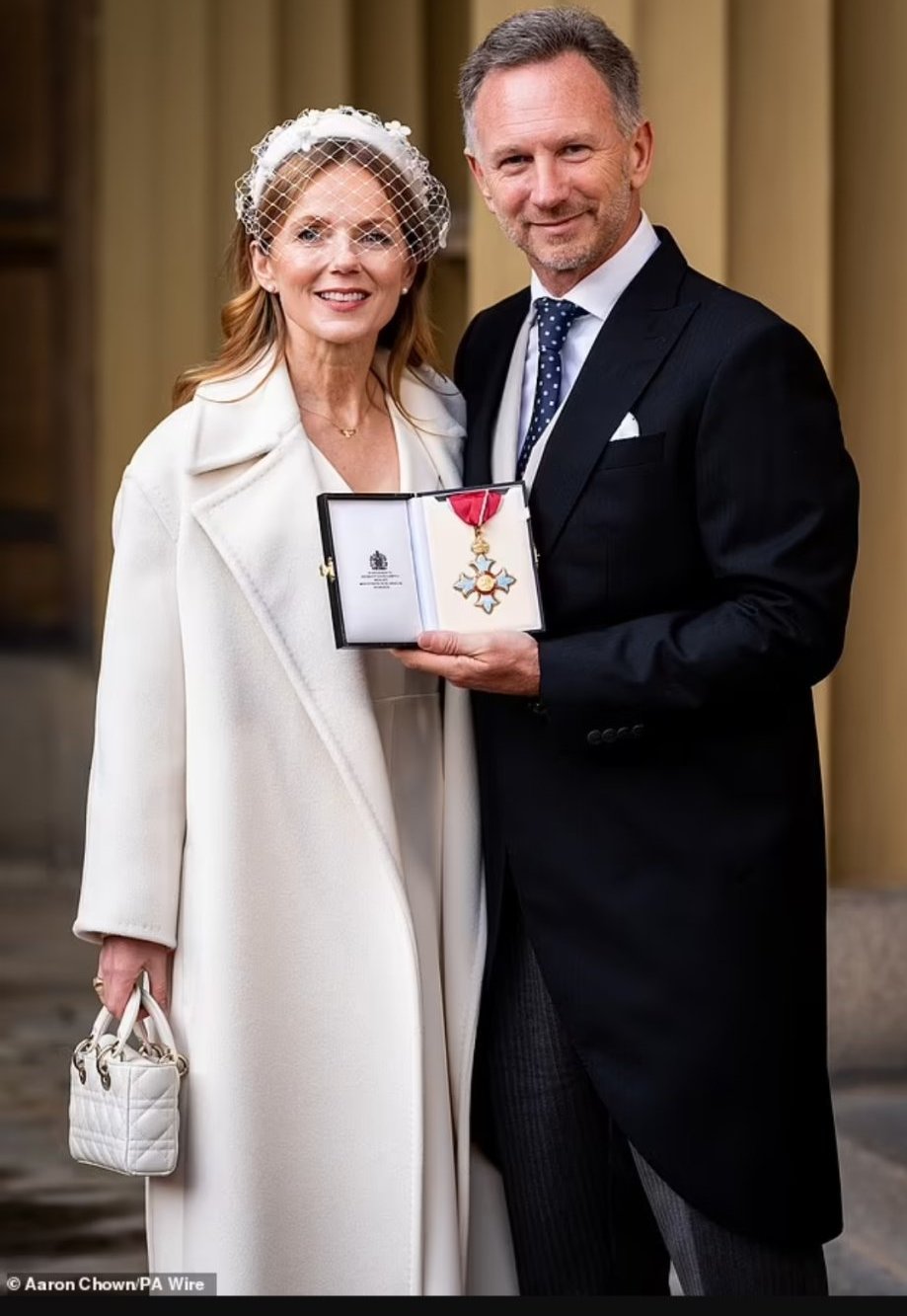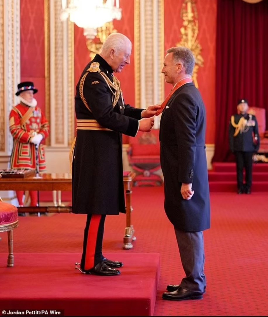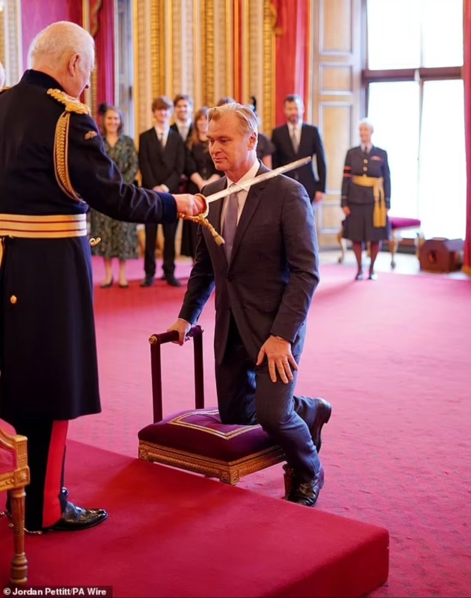 Ема Нолан, Кристофър Нолан, Кристиан Хорнър и съпругата Гери Хорнър на инвеститура при крал Чарлз III в Бъкингамския дворец.