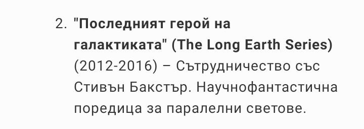 Морис няма нищо общо с дядо Прас, Дългата земя няма общо с Последният герой (има такава книга на Пратчет, но не е на Галактиката), а преводите на Клавиатура грешка и Фолклора на света на Диска са безумни, не мога да ги определя по друг начин.
