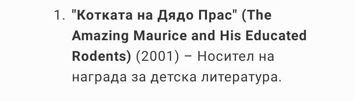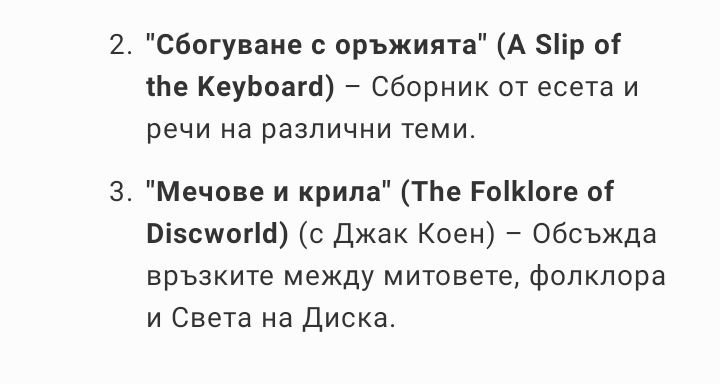 Препоръки за книги на Тери Пратчет, които не са от поредицата за Диска (или поне са периферия) - книгите са преведени на български, не са неизвестни, по Изумителният Морис има и детски филм. Въпреки това, неговите заглавия на български са меко казано странни (взех само няколко примера):