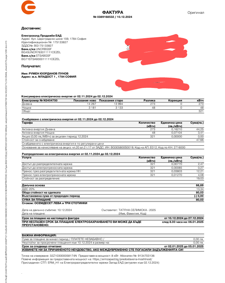 184 лв, периода е 09.11.24 - 09.12. 24.