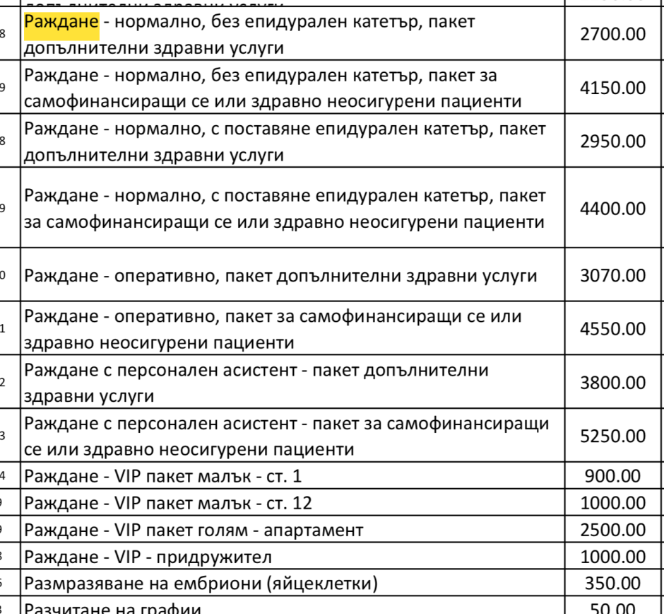 Между другото видях, че в ценоразписа на болниците има избор на лекар и отделно избор на екип. В допълнителното здравно осигуряване имам лимит от 500 или 600лв. за избор на екип....трябва да им се обадя да попитам дали важи и само при избор на лекар. Това са актуалните цени за раждане в Окръжна болница в Бургас, както и списък за родилното. 🤗 Интересно как присъствието на бащата е 200лв., а на друг придружител е 150лв. 😅 Малко скъпичко ми се вижда 80лв за самостоятелна стая(НЕ е с подобрени битови условия 🤣, просто си сама). Луничке, колко излиза раждането в тази болница? Предполагам е по-скъпо, щом не се доплащат за придружител.