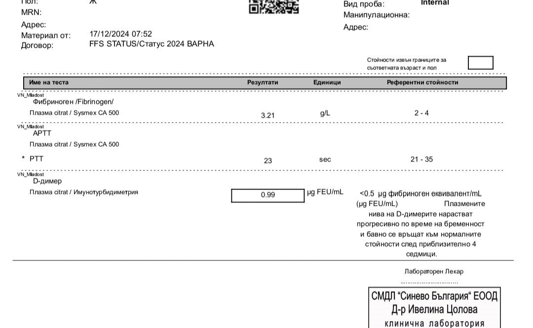 При мен фибриногенът е 6,05, при норма за втори триместър 5,4 и аРТТ е 36,3 секунди, при норма 27-35.
