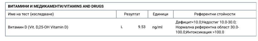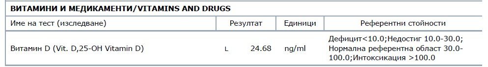 Резултат след година- вит. Д малко над долна граница, наднормен калций ( вероятно в кръвта и бъбреците), и минус 4.9 костна плътност, т.е. едва ме засича че имам кости апаратът за костна плътност.