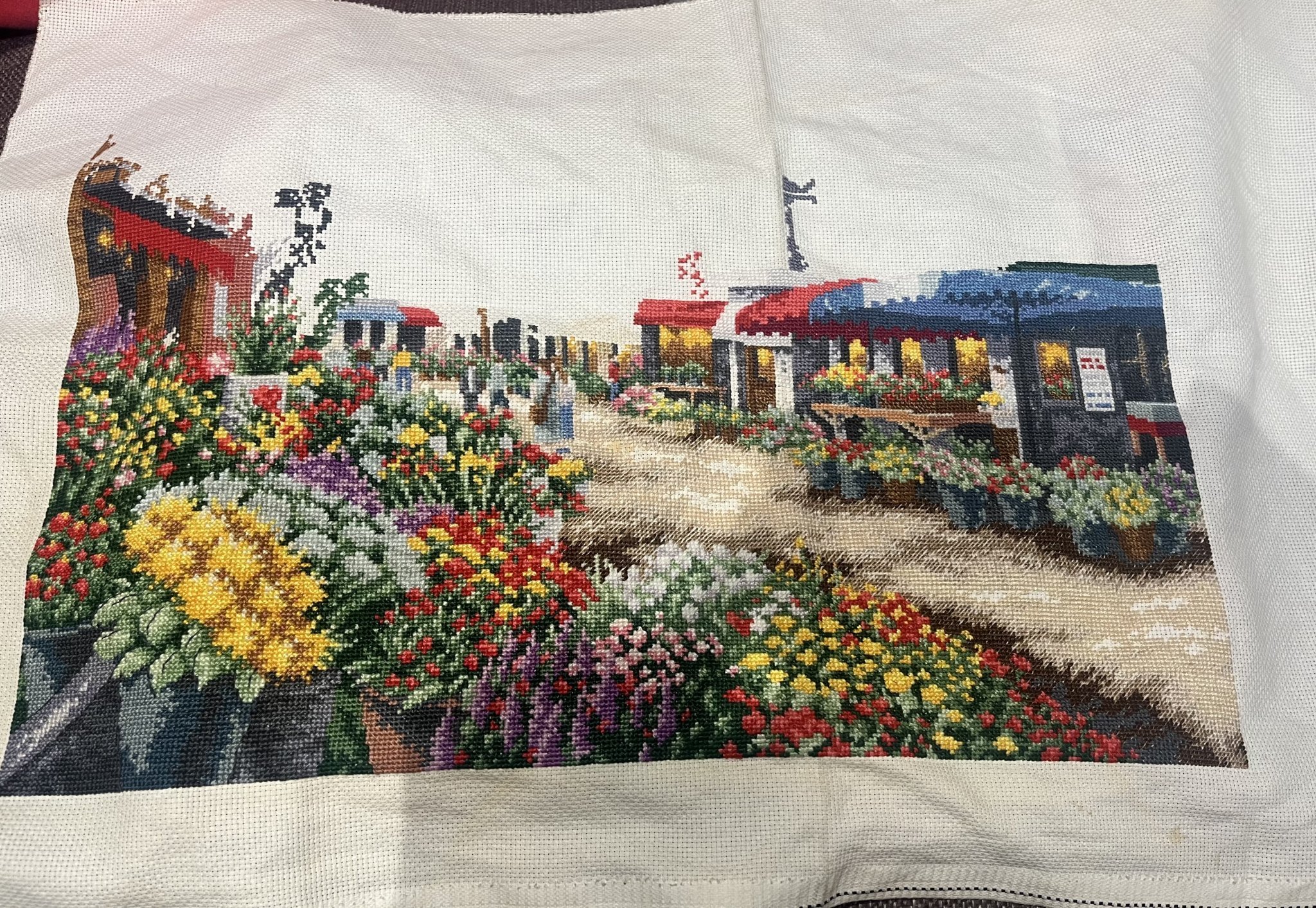 Етапче от моят Парижки пазар. Незнам с кой акъл съм се захванала преди години да го комплектовам сама, но тъкмо уших синия чадър и нещо не ми допадна единия син цвят, та снощи цяла вечер се мъча да го разшивам. Има ли някоя да е шила оригинала и да има каталога с конците на ДМС, за да ми сравни цвят М 17161 на кой отговаря?