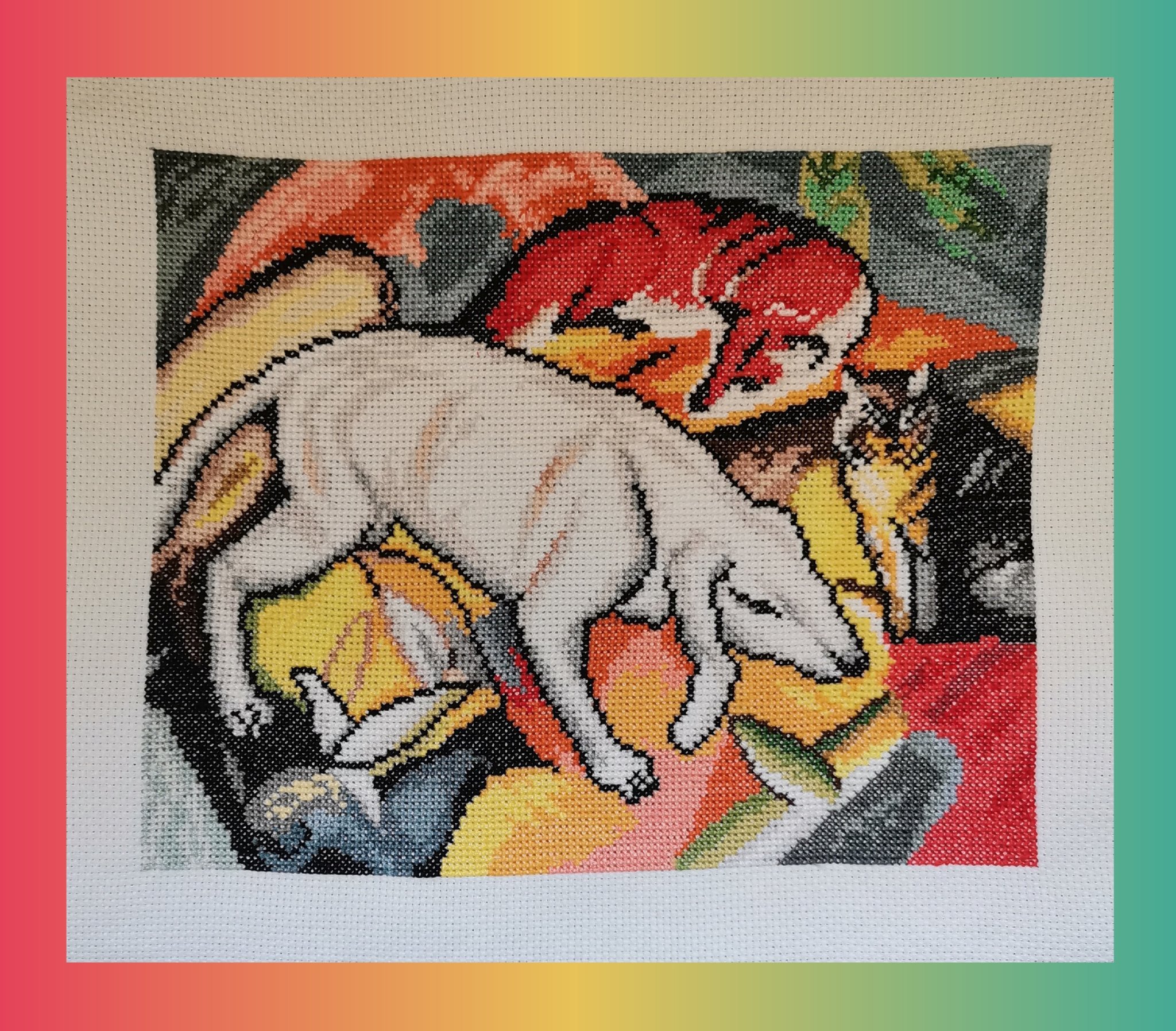 Май не съм го показвала: Комплект на Корикамо, реплика по картина на Франц Марк. Ших го за Националната среща на която така и не отидох 😀