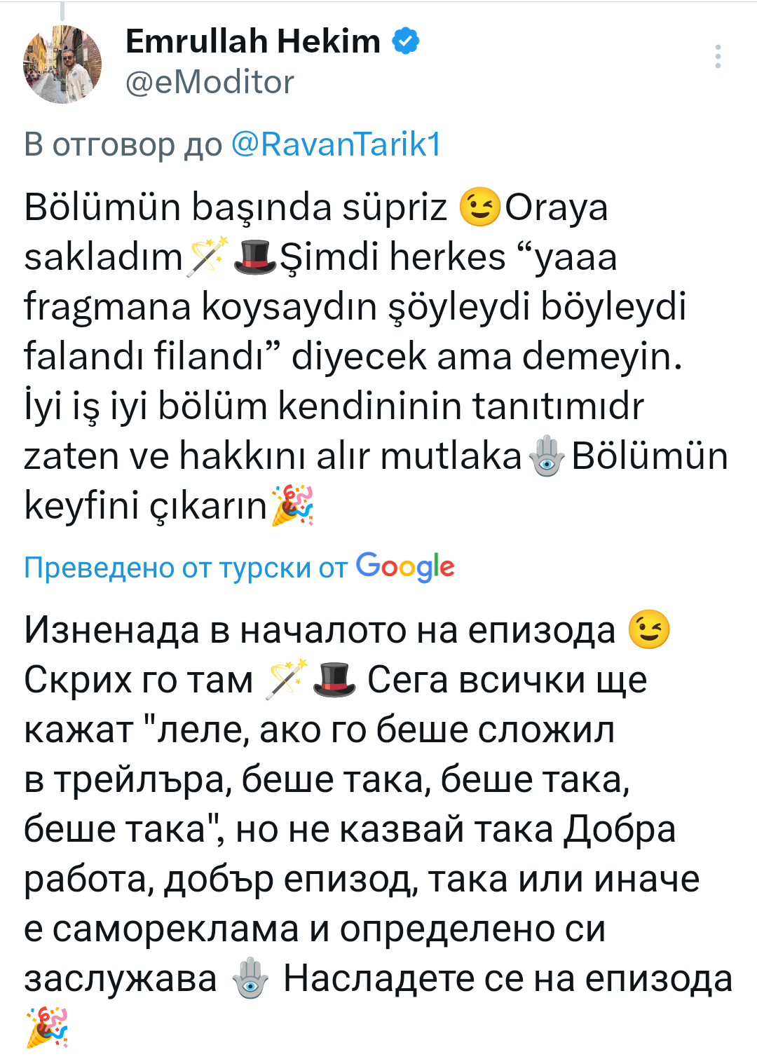 Връзката на Суна със Сейран се задълбочава, според превод от руски! А и си мисля, че Феро и Суна няма какво да задълбочават! В трея когато Сейранчето е с шапката много странно гледа Суна! В петък ще разберем какво и що ! 😂