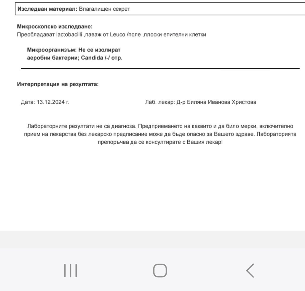 Мисля, че всичко си е наред с изследването. Лактобацили е нормално да има, а за кандидата пише отрицателно.