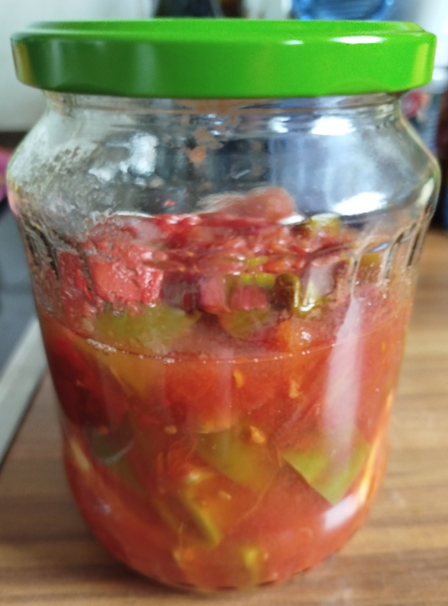 Ето я и любимата зимна салата на моето семейство - нарязани домати и чушки, сол и доматен сок колкото да се изравни с тях. Стерилизира се за 5-6 мин. През зимата изсипваме в купички, добавяме нарязан лук и овкусяваме с оцет, зехтин и още сол ако има нужда: