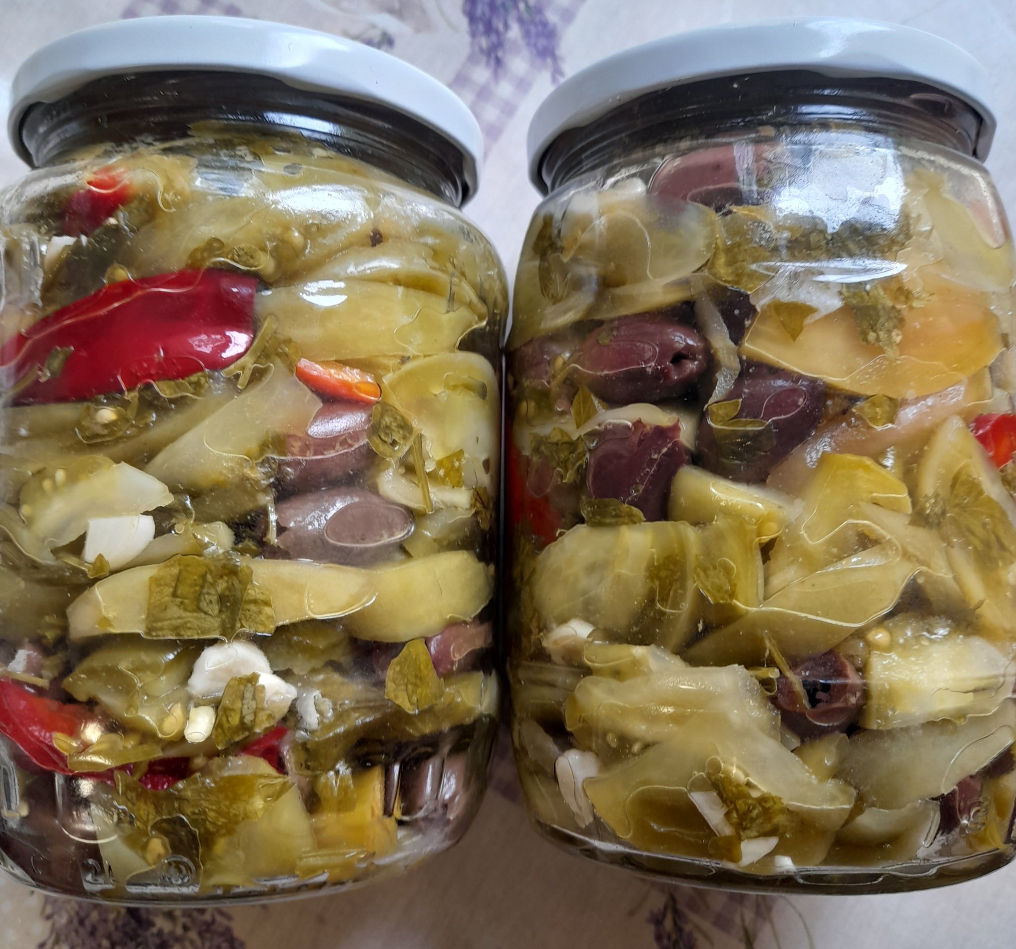 Гръцка разядка със зелени домати, маслини,камби.Много сполучлива за мен рецепта(от нета)По рецепта се стабилизира с аспирин, аз заварих 5 минути за капака.