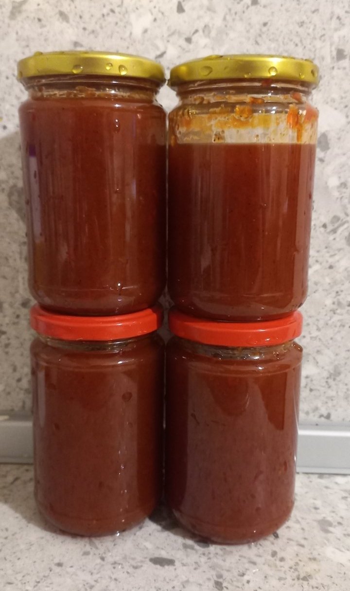 И аз се чудих какви чушки се използват, предположих, че червени, но продават само зелени и съм го правила със зелени. Слагах по няколко червени чорбаджийски, защото имам домашни, че да оцветят сместа. В последната доза и аз намалих захарта с 50 грама мисля, че рибките не са много люти.