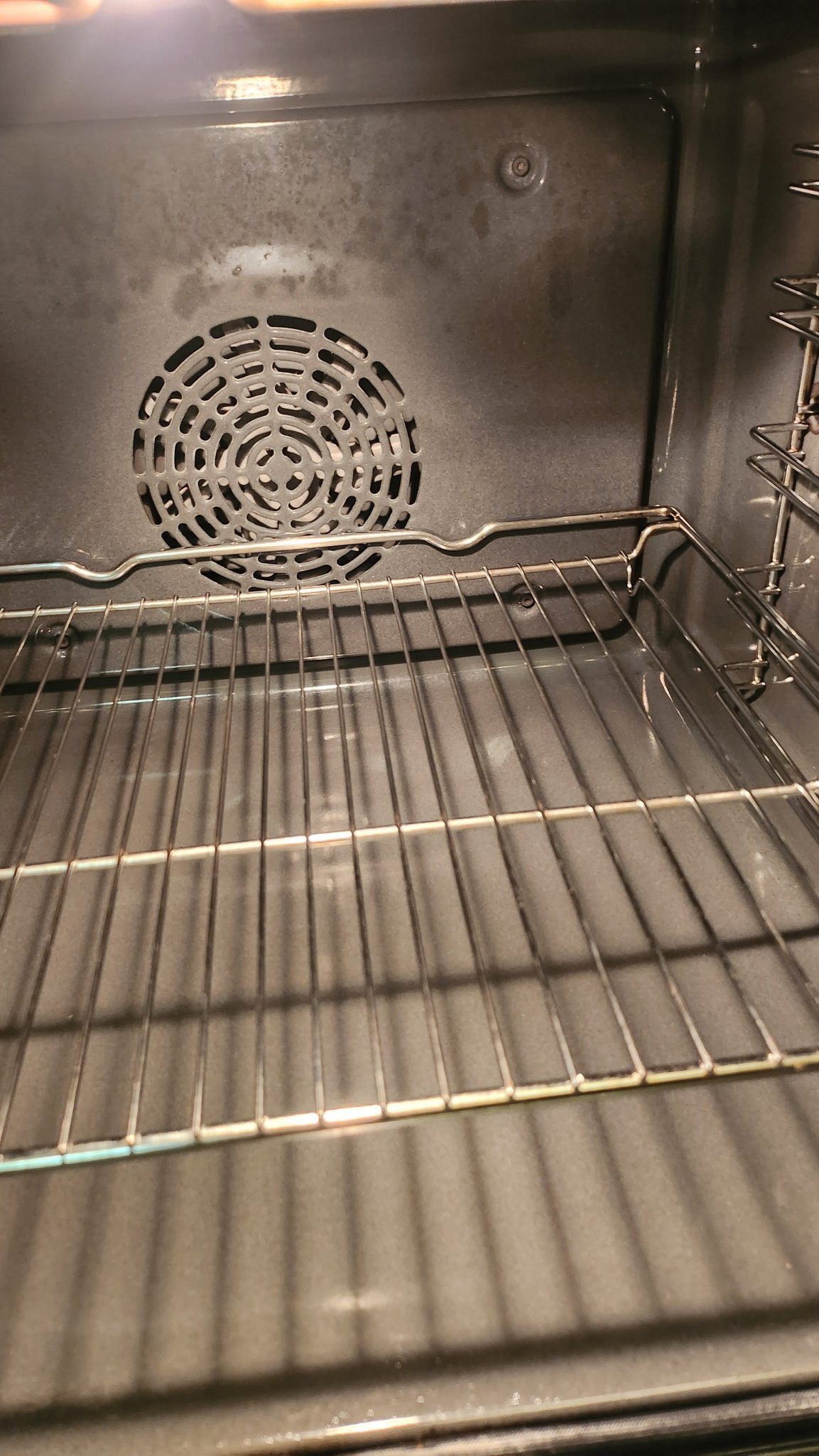 В дъното над вентилатора се виждат едни мазни петна, а в зависимост от печивото, може и да са кафяви, да има и по страничните стени, но това е - няма цели реки нито от мазнина, нито от вода:
