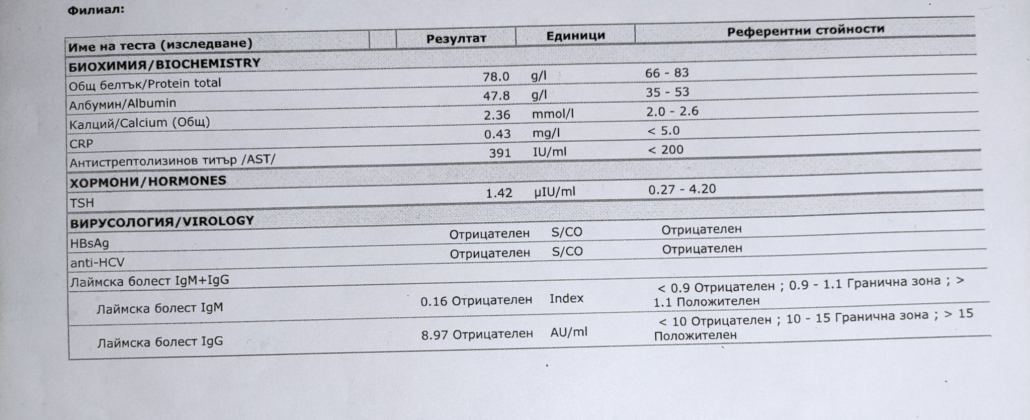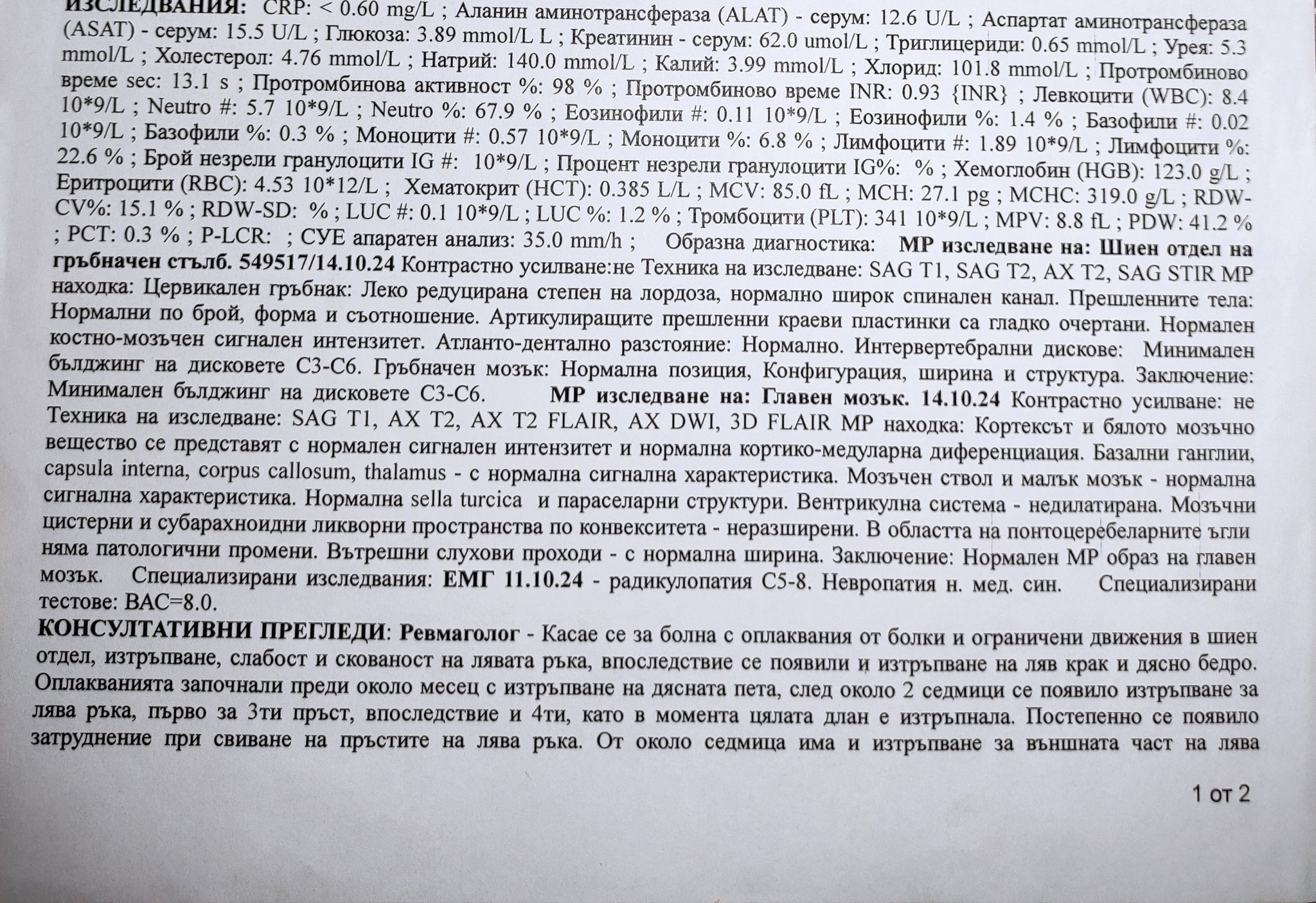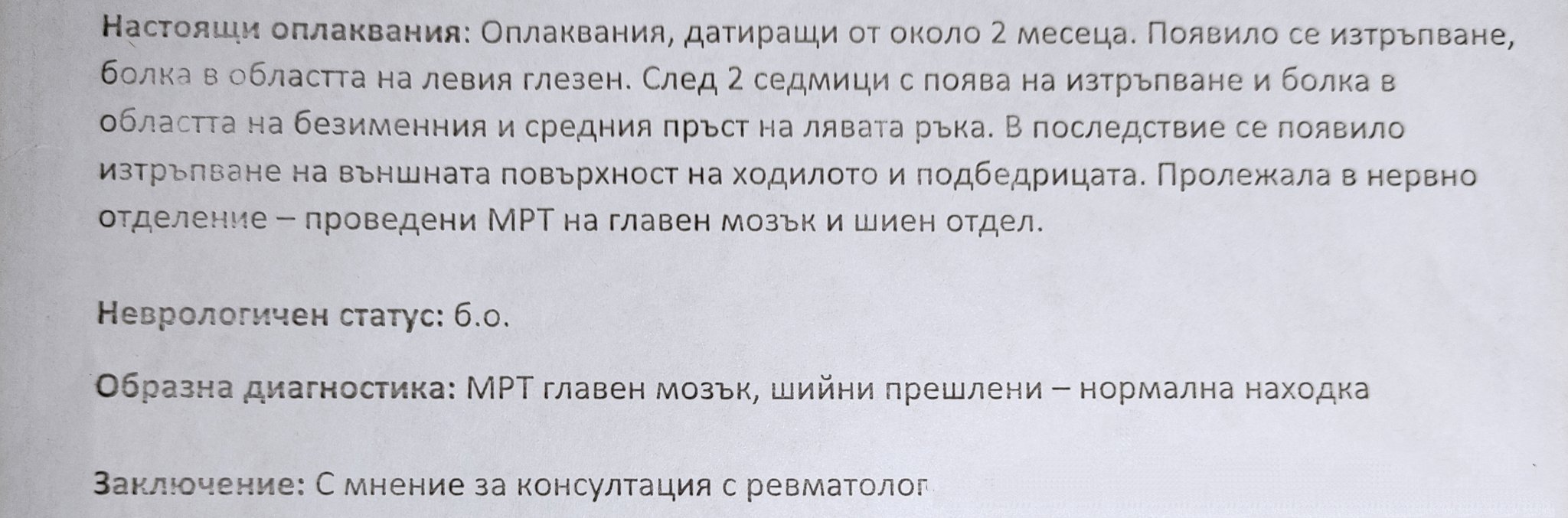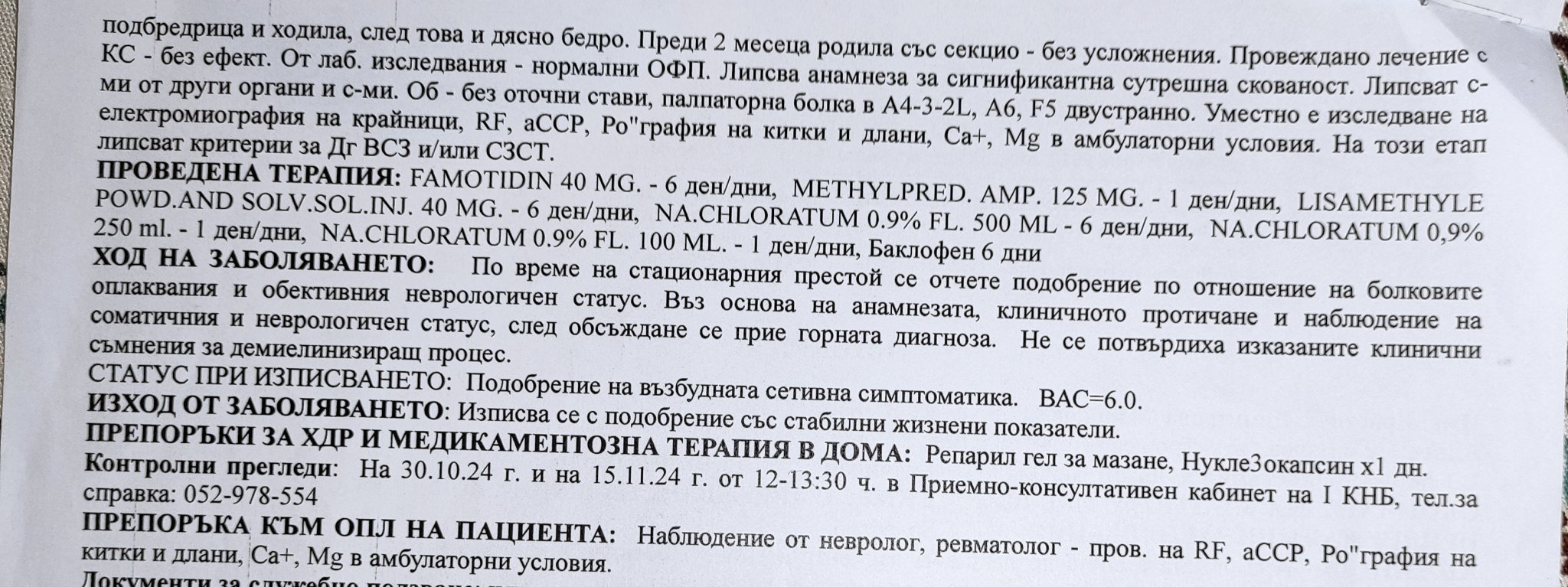 ЦРП излезе 55 при норма 5, но той каза, че било нормално за скоро раждала жена. Ще прикача всички изследвания и епикризи за да се запознаете подробно. Когато се върнах след 2 дни при личния лекар с изследванията вече ми беше изтръпнал и безименния пръст. Тъй като съм кърмачка, не ми изписа нищо друго, каза само да се мажа с крема и ако до седмица не ми мине за ходя да ми биел някаква инжекция, която според него щяла да ме оправи. Питах за невролог. Каза, евентуално може да ме прати тогава. Минаха 4 дни и никакво подобрение, затова без да чакам повече отидох на невролог. Докторката ме изслуша, прегледа ме на бързо, пренебрегна проблема с краката, каза, че било за ортопед. За ръката каза, че е възпален нерв на лакътя написано в амбулаторния лист - Увреждания на междупрешленните дискове и шийния отдел с радикулопатия и изписа дископ@тин и инжекции д€ксом€тазон, които личния лекар смени за м€тилпр€днизолон защото се съобразихме с кърменето.Започнах ги, всеки ден по 1 /40мг/ за 5 дни, но не само, че нямаше подобрение, но се появи изтръпване / болезнено възпаление/ на подбедрицата на левия крак и странично на ходилото. Междувременно смених личния лекар поради смяна на адрес и посетих новия личен лекар. Той назначи нови изследвания. ЦРП вече беше в норма, както и всичко останало. Правих снимка на врата със заключение - остеофити по прешленните тела - начални. Взех направление и отидох на друг невролог. Докторката ме прегледа и каза, че са ми много разхвърляни симптомите и не може да даде точна диагноза . Прати ме за прием в болницата за уточняване на диагноза, като предположението й беше първо демиелинизираща болест на централната нервна система, неуточнена и второ множествена склероза. Приеха ме там но трябваше да чакам няколко дни за ЯМР защото нямаше свободни часове. Междувременно ми вливаха система с ¥рбазон 125млг и на втория ден ми изтръпна езика, който вече два месеца е така. Направиха ми ЯМР като се установи, че нямам проблеми в мозъка и нямам МС. Изписаха ме, въпреки, че им казах, че не съм добре. В епикризата пише - увреждане на шийни коренчета и, че съм изписана с подобрение, а всъщност аз се влоших. Междувременно бях изчела половината интернет, за да разбера какво ми има. Поисках консулт с ревматолог. Дойде докторка и от моето описание на симптомите каза, че можело да е реактивен артрит. Насочиха ме към личния лекар. Той ми даде направление за ревматолог. Там докторката назначи изследвания. Ревма фактор, Ана профил и др., както и рентгенова снимка на ръката. Излязоха изследванията и показателя AST беше двойно завишен и тогава тя каза, че било реактивен артрит. Изписа ми антибиотик sumamed, но и от него не видях полза. Изтръпна ми дясното бедро. Посетих друг ревматолог. Тази докторка ми сложи две диагнози - Синдром на Рейно и Множествен мононеврит. Още не ми бяха излязли резултатите от АНА. Препоръча прием в болницата в отделението по вътрешни болести за да ми направят капиляроскопия и консулт със съдов хирург. Не влязох в болницата, защото ми беше изключително трудно да оставя бебето и другите две деца. Съпруга ми работи с дълги смени и нямаме кой да помага. Последва преглед при гинеколога за да проверя дали няма проблем там. Той каза, че всичко е наред. Пуснахме цитонамазка и секрет.