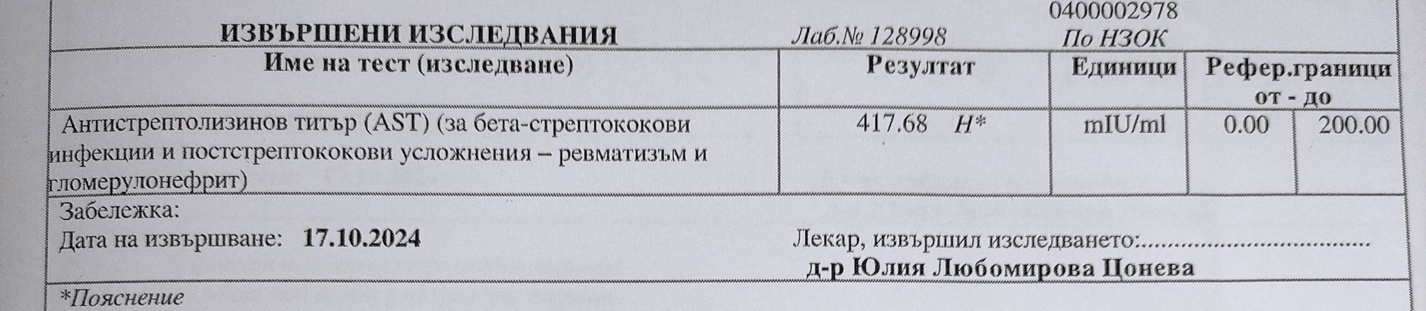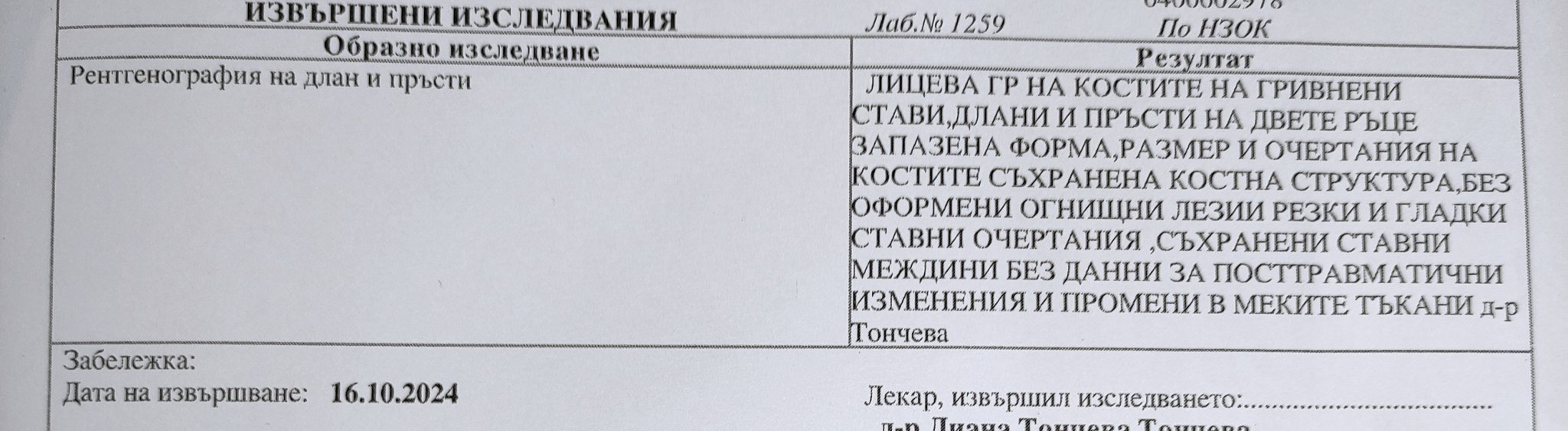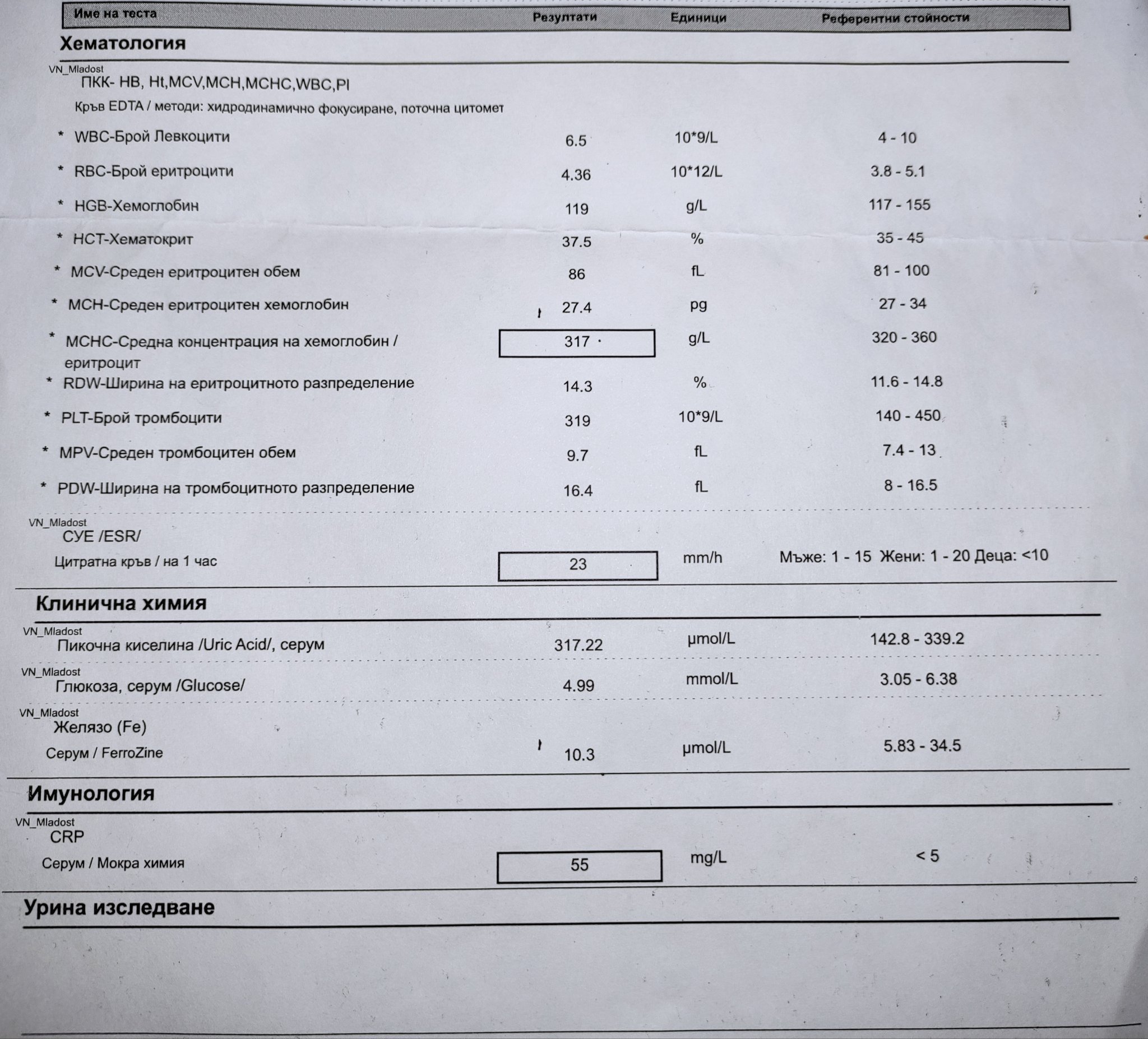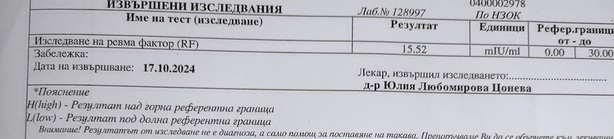 ЦРП излезе 55 при норма 5, но той каза, че било нормално за скоро раждала жена. Ще прикача всички изследвания и епикризи за да се запознаете подробно. Когато се върнах след 2 дни при личния лекар с изследванията вече ми беше изтръпнал и безименния пръст. Тъй като съм кърмачка, не ми изписа нищо друго, каза само да се мажа с крема и ако до седмица не ми мине за ходя да ми биел някаква инжекция, която според него щяла да ме оправи. Питах за невролог. Каза, евентуално може да ме прати тогава. Минаха 4 дни и никакво подобрение, затова без да чакам повече отидох на невролог. Докторката ме изслуша, прегледа ме на бързо, пренебрегна проблема с краката, каза, че било за ортопед. За ръката каза, че е възпален нерв на лакътя написано в амбулаторния лист - Увреждания на междупрешленните дискове и шийния отдел с радикулопатия и изписа дископ@тин и инжекции д€ксом€тазон, които личния лекар смени за м€тилпр€днизолон защото се съобразихме с кърменето.Започнах ги, всеки ден по 1 /40мг/ за 5 дни, но не само, че нямаше подобрение, но се появи изтръпване / болезнено възпаление/ на подбедрицата на левия крак и странично на ходилото. Междувременно смених личния лекар поради смяна на адрес и посетих новия личен лекар. Той назначи нови изследвания. ЦРП вече беше в норма, както и всичко останало. Правих снимка на врата със заключение - остеофити по прешленните тела - начални. Взех направление и отидох на друг невролог. Докторката ме прегледа и каза, че са ми много разхвърляни симптомите и не може да даде точна диагноза . Прати ме за прием в болницата за уточняване на диагноза, като предположението й беше първо демиелинизираща болест на централната нервна система, неуточнена и второ множествена склероза. Приеха ме там но трябваше да чакам няколко дни за ЯМР защото нямаше свободни часове. Междувременно ми вливаха система с ¥рбазон 125млг и на втория ден ми изтръпна езика, който вече два месеца е така. Направиха ми ЯМР като се установи, че нямам проблеми в мозъка и нямам МС. Изписаха ме, въпреки, че им казах, че не съм добре. В епикризата пише - увреждане на шийни коренчета и, че съм изписана с подобрение, а всъщност аз се влоших. Междувременно бях изчела половината интернет, за да разбера какво ми има. Поисках консулт с ревматолог. Дойде докторка и от моето описание на симптомите каза, че можело да е реактивен артрит. Насочиха ме към личния лекар. Той ми даде направление за ревматолог. Там докторката назначи изследвания. Ревма фактор, Ана профил и др., както и рентгенова снимка на ръката. Излязоха изследванията и показателя AST беше двойно завишен и тогава тя каза, че било реактивен артрит. Изписа ми антибиотик sumamed, но и от него не видях полза. Изтръпна ми дясното бедро. Посетих друг ревматолог. Тази докторка ми сложи две диагнози - Синдром на Рейно и Множествен мононеврит. Още не ми бяха излязли резултатите от АНА. Препоръча прием в болницата в отделението по вътрешни болести за да ми направят капиляроскопия и консулт със съдов хирург. Не влязох в болницата, защото ми беше изключително трудно да оставя бебето и другите две деца. Съпруга ми работи с дълги смени и нямаме кой да помага. Последва преглед при гинеколога за да проверя дали няма проблем там. Той каза, че всичко е наред. Пуснахме цитонамазка и секрет.