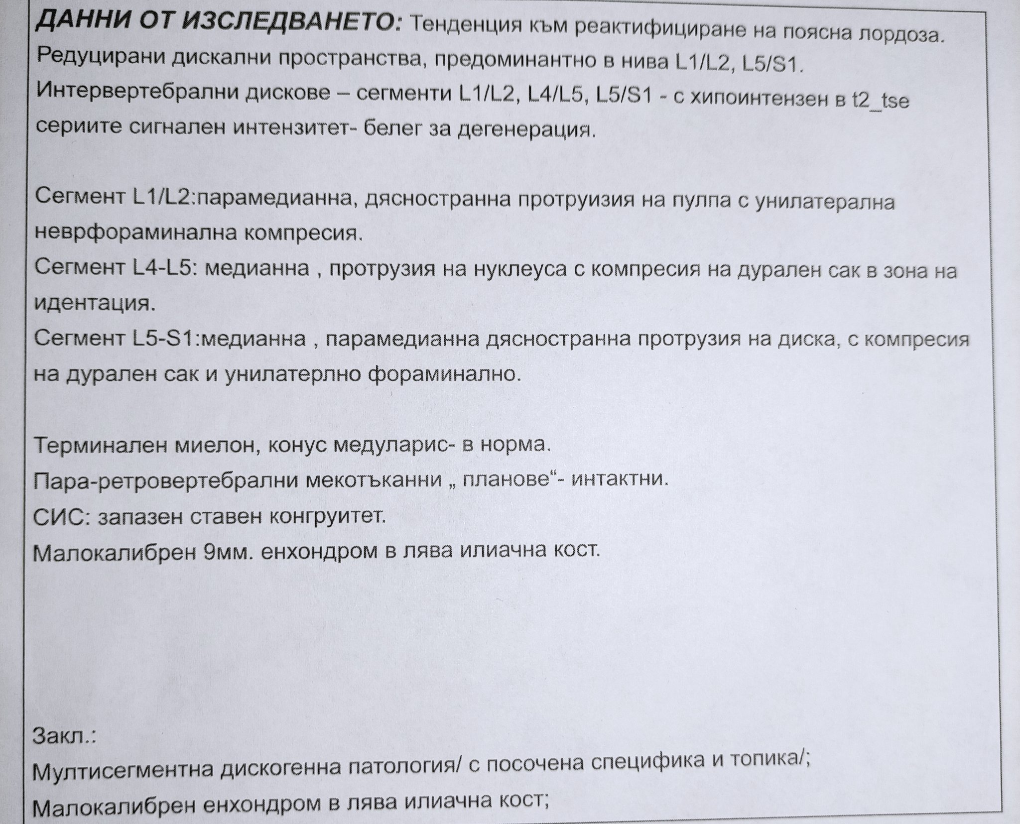 Препоръчаха ми да отида на преглед при неврохирург, който след 5 Мин обяснения от моя страна и преглеждане на всички изследвания каза, че не ми бил неврологичен проблема и да спра да ходя по невролози, а да отида на ревматолог. Прати ме при такъв. Отидох и там чух, че нямам ревматологичен проблем, а неврологичен. Последваха отново изследвания - за Лаймска болест, за хепатити и всичко отрицателно. Изписа ми да изпия еднократно едно хапче прегабин за да видим дали ще има ефект за да затвърди, че е неврологичен проблема. Изпих го по препоръка вечерта и легнах /после два дни не кърмих/ но на следващия ден бях като пияна и дрогирана едновременно. Усещах леко, много леко подобрение, но не бях сигурна дали не е от това, че бях толкова замаяна. Доктора каза, че това потвърдило, че имам проблем с централната нервна система. Препоръча да ми се направи пункция и да се изследва ликвор за евентуален вирус, който да причинява това. Аз отначало се съмнявах, че може пък и от упойката при секциото нещо да е станало, правих ЯМР на лумбални прешлени. После посетих друг неврохирург, тя ми сложи диагноза - увреждания на междупрешленните дискове в поясния и другите отдели на гръбначния стълб с радикулопатия и ме прати при началника на отделението по неврология/това е друга болница, не там където лежах/ тя да ме прегледа, евентуално да ме приеме и да ми се направи пункцията. Отидох на преглед при нея, но тя категорично отказа да ме приема и да прави пункция. Каза, че съм имала полиневропатия - неуточнена и това, че кърмя няма как да пия лекарства. Аз съм съгласна да спра да кърмя, но да знам наистина диагнозата и нужното лечение. Не искам да правим експерименти. Освен това тя каза, че дори и да пия лекарства е възможно да не се оправя на пълно и да отнеме много време.