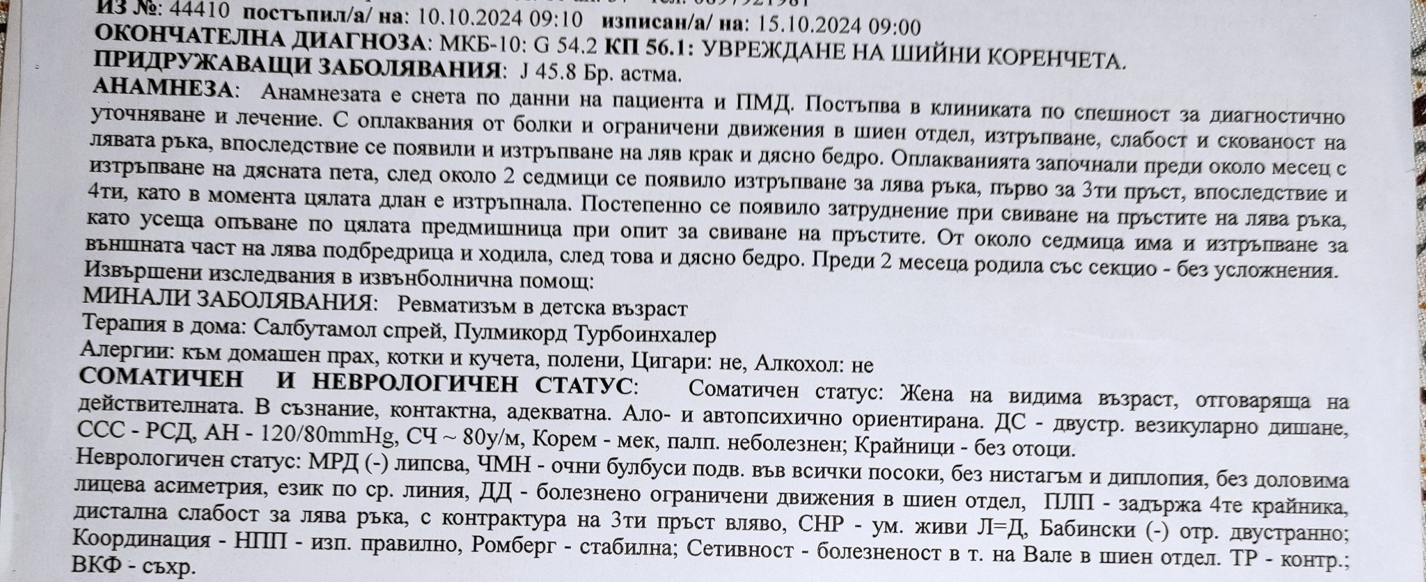В началото на август тази година родих третото си дете секцио със спинална упойка. Имах трудно възстановяване. Ужасни болки в главата преминаващи във врата и гръбначния стълб две седмици. Не можех да ставам от леглото и бях на обезболяващи. След това започнах с разходките с бебето на вън и грижата за другите две деца. В края на август / не помня точно кога, защото покрай децата и ежедневието в началото не обърнах внимание мислех, че съм се претоварила/ изведнъж ми изтръпна дясната пета, беше като възпалена и много болезнена. Под глезена от вътрешната страна ме болеше ужасно и не можех да стъпвам. На левия крак пък на възглавничката на ходилото при ходене усещах някаква подутина, все едно имах топче или стъпвах на камъче. Отделно не бях обърнала внимание, че имах и рана от горната страна на лявото ходило, която не зарастваше доста време. Започнах да мажа с йод@септ и да покривам с марля и след няколко дни стана коричка. Уж зарастна, но остана тъмен белег, който все още е там. В средата на септември изведнъж ми се схвана / изтръпна средния пръст на лявата ръка. При изпъване на ръката усещах някаква жилка, която преминаваше през цялата ми ръка и опъваше пръста. Посетих личния лекар, който след преглед каза, че съм била с възпалено рамо и ми изписа @фламил да се мажа. Пусна ми направление за изследвания и отделно аз си пуснах и вит. Д и вит. Б12.